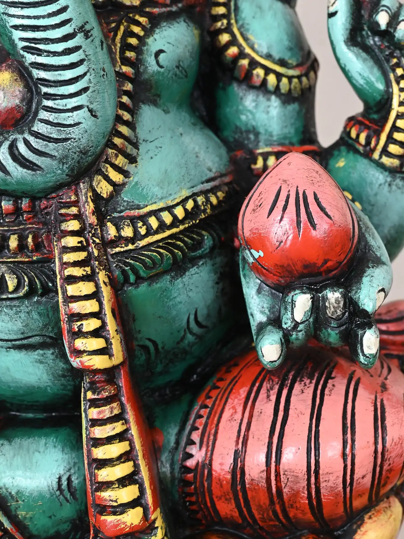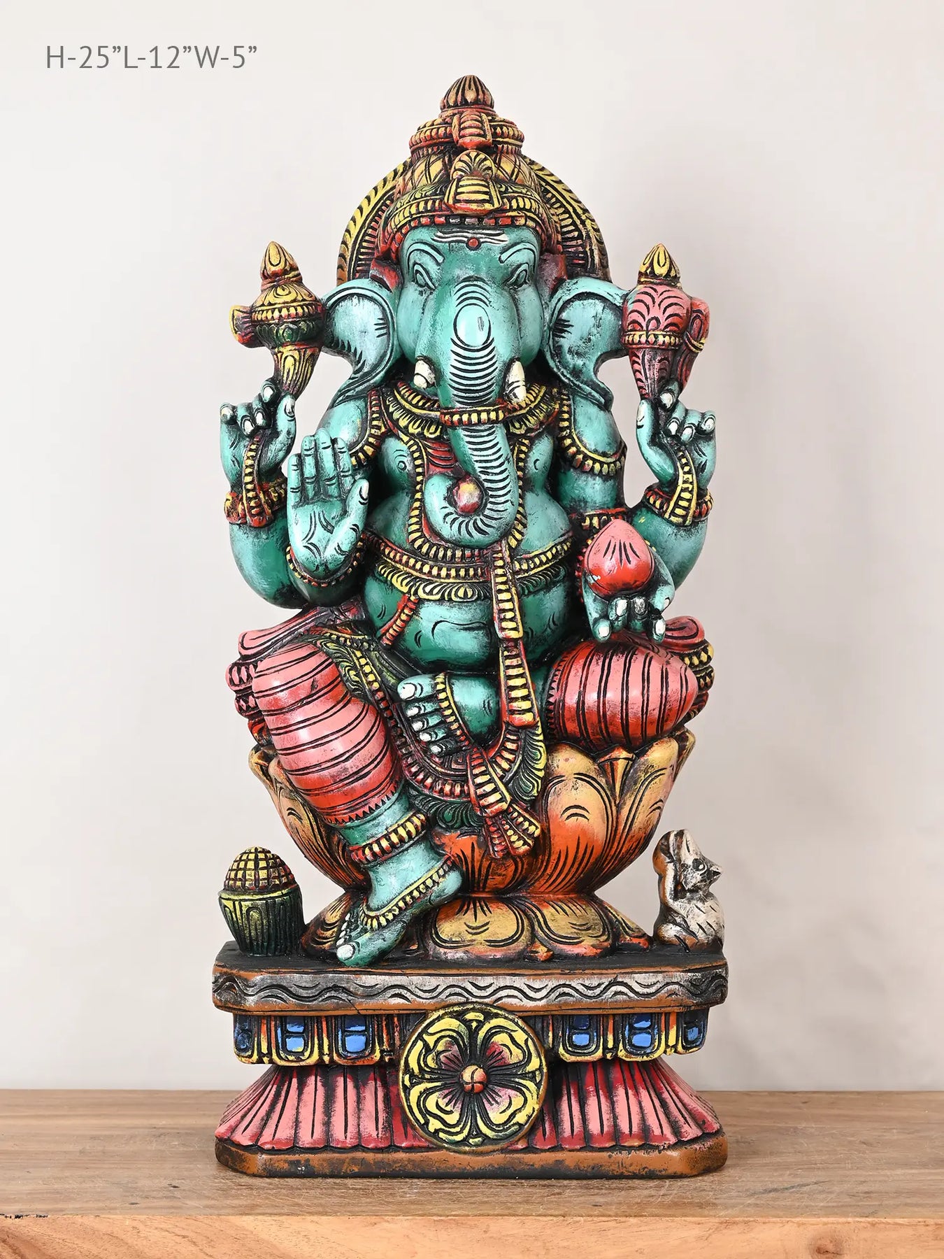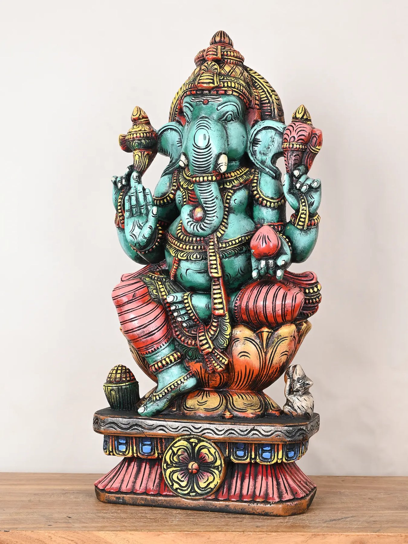 Lord Ganapathi wooden statue is shown seated majestically on a lotus pedestal, the deity has four arms, each holding symbolic objects. The trunk of Ganesha curves gracefully to one side, and at the base, his vahana, the mouse, is carved attentively. Adding for any space in the home