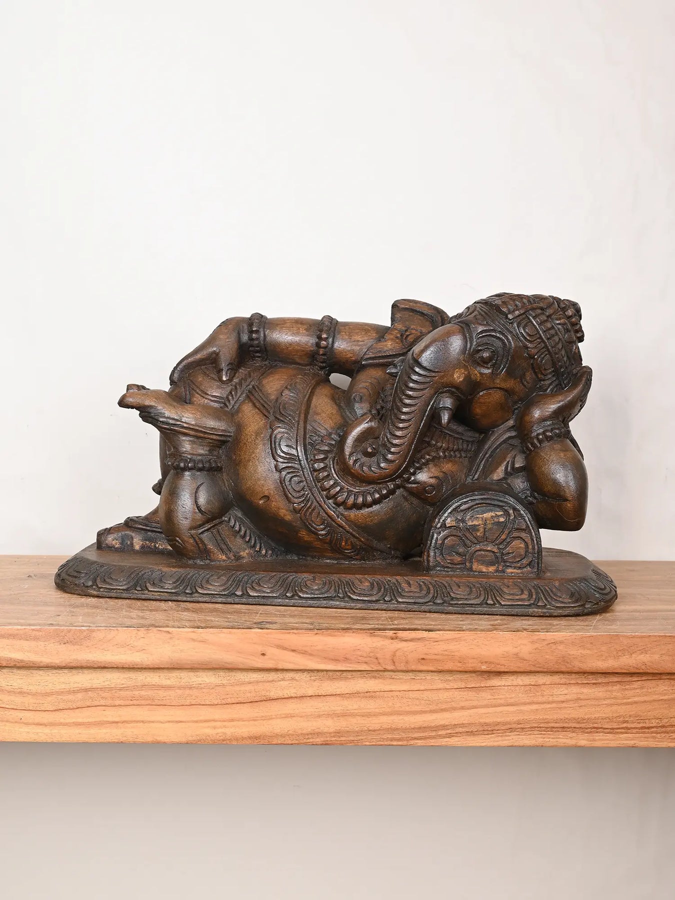 Lord Ganesha wooden sculpture portrays in a relaxed reclining position on a cushion. The meticulous carving and tranquil expression enhance the statue’s ability to infuse any space with a sense of peace and spirituality.