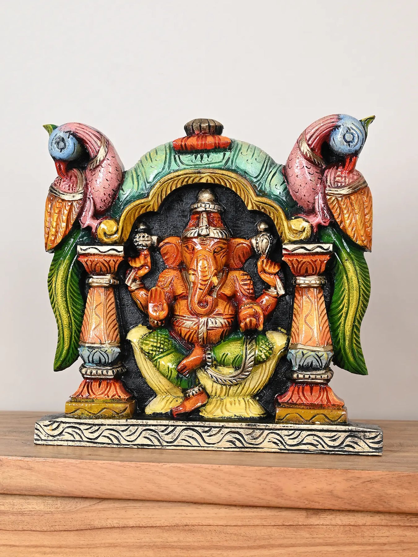 Wooden wall mount Lord Ganesha is seated on a lotus, framed by two carved parrots. Its traditional colors add sacred beauty to any wall or prayer area.