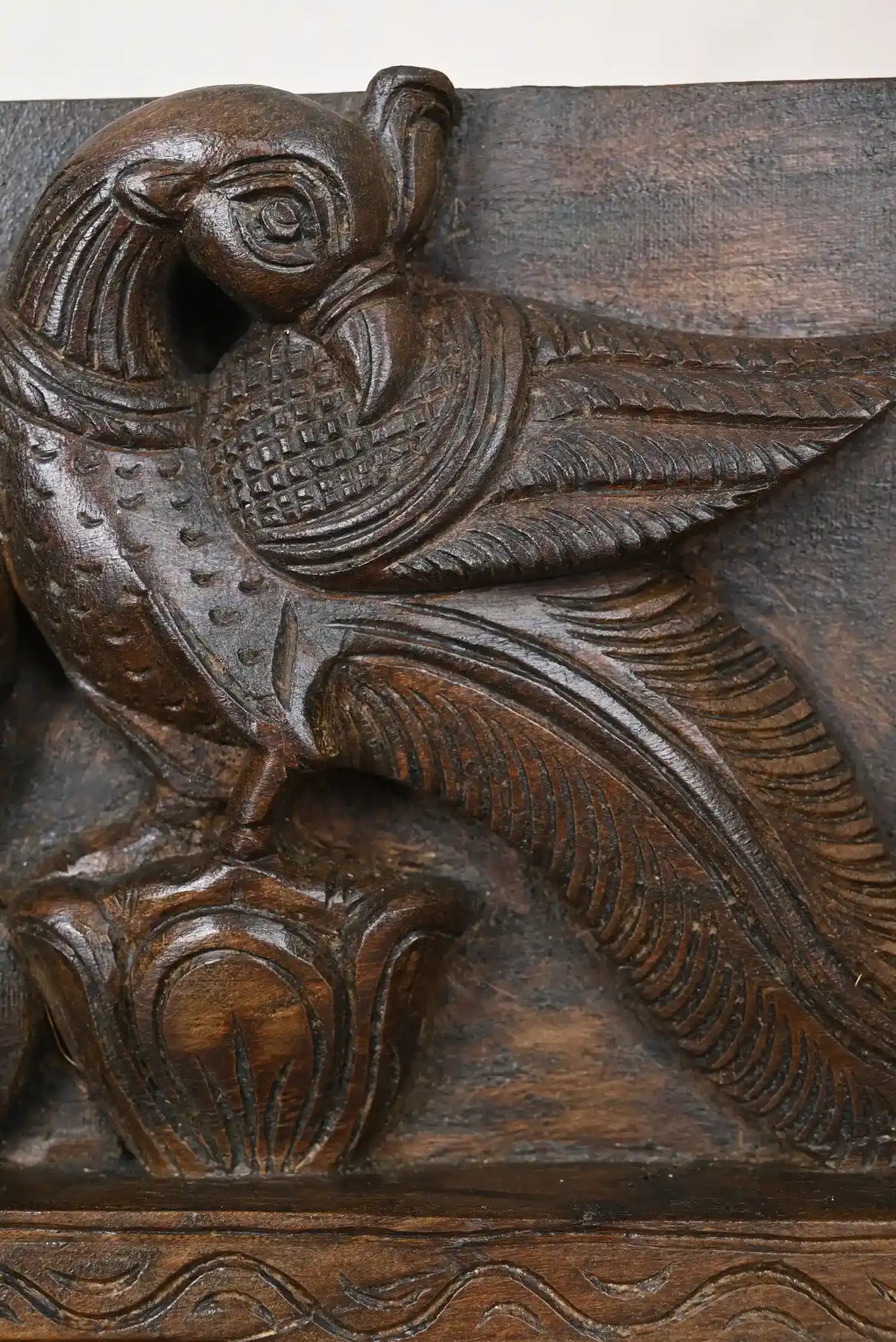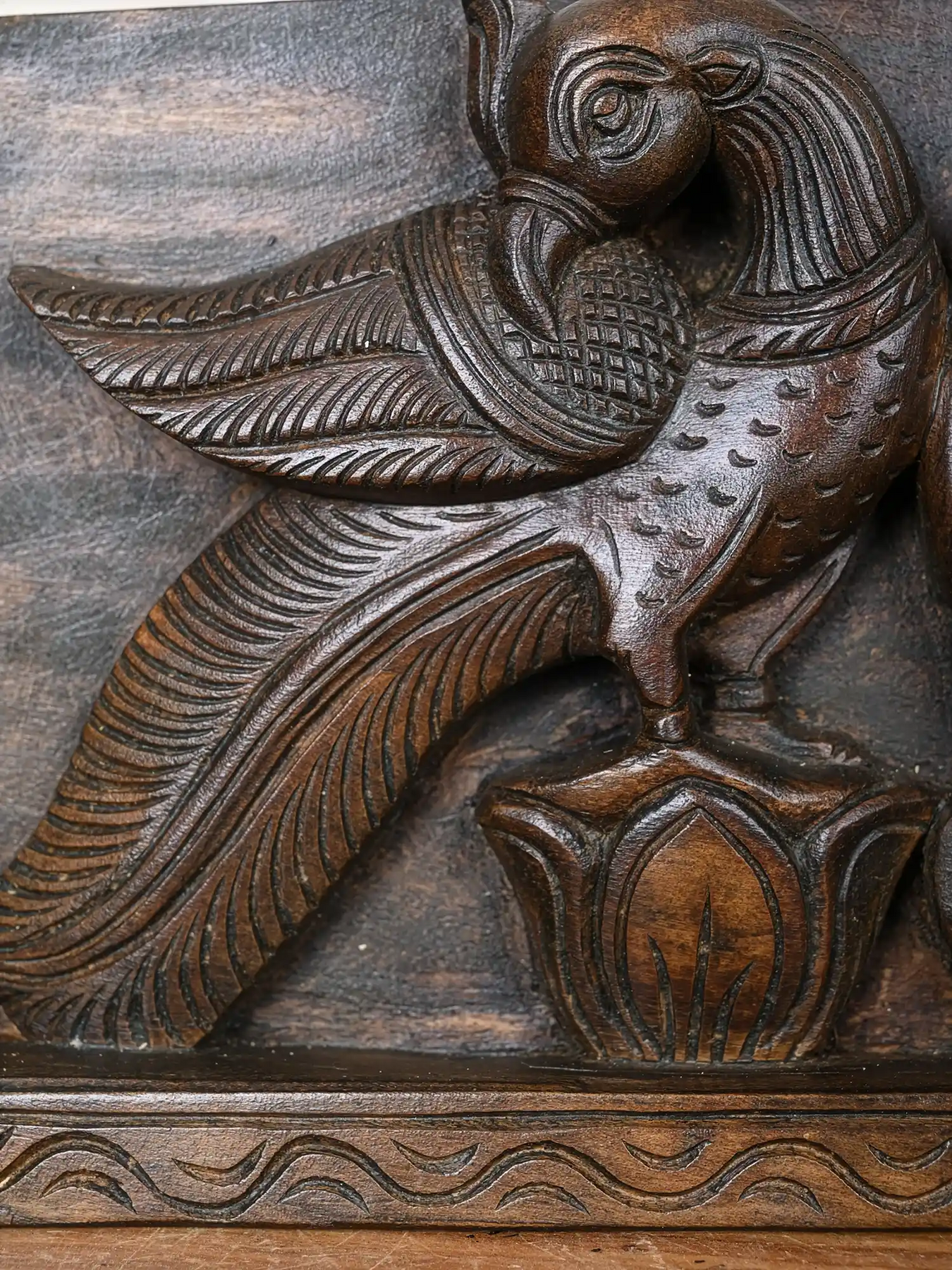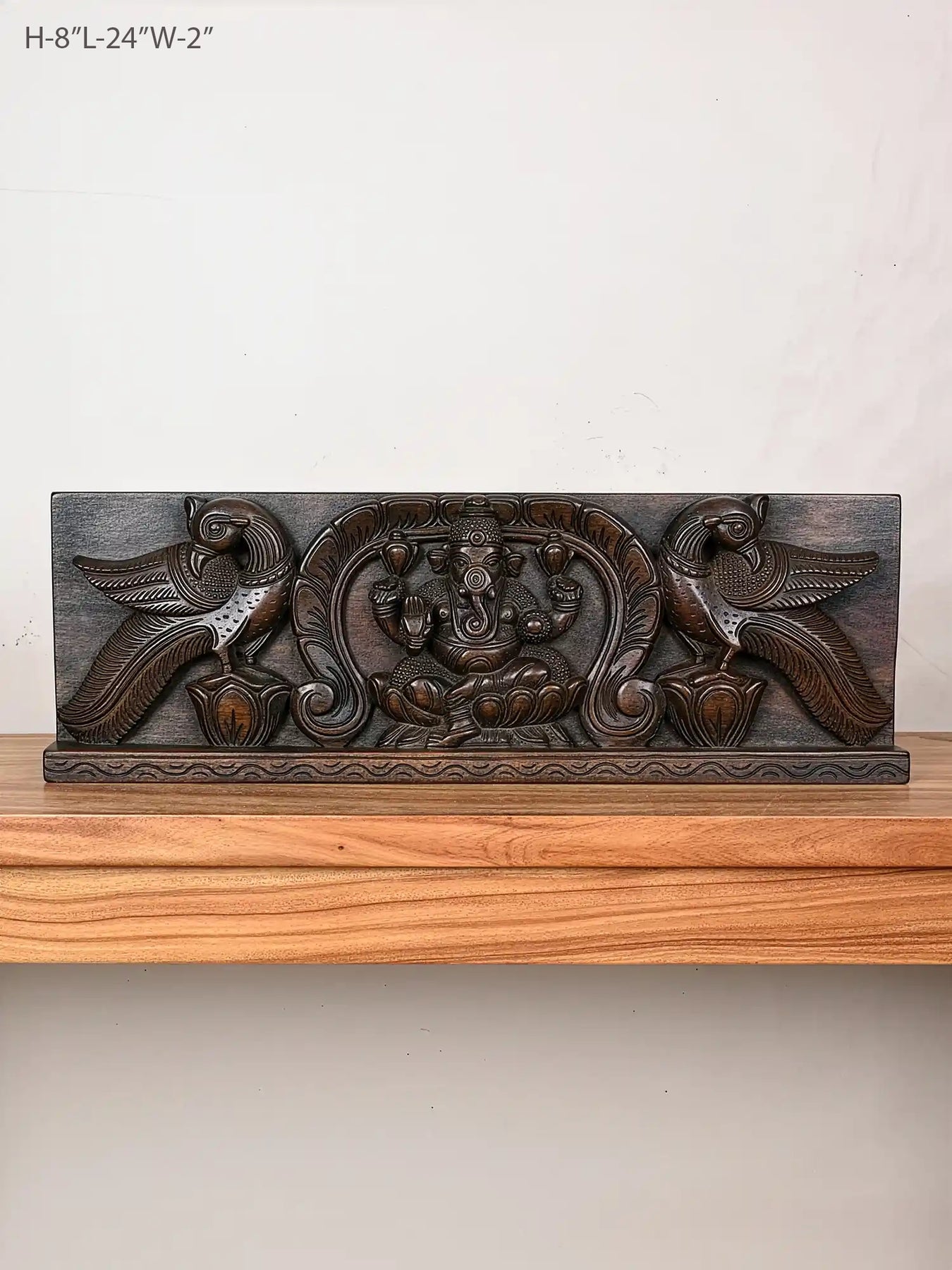 Wooden wall panel of Lord Ganesha features two intricately carved peacocks on either side, their feathers gracefully spread. The deity is framed by an ornate arch adorned with elegant flowing scrollwork patterns.