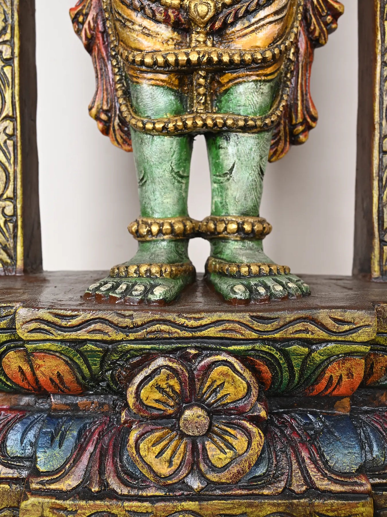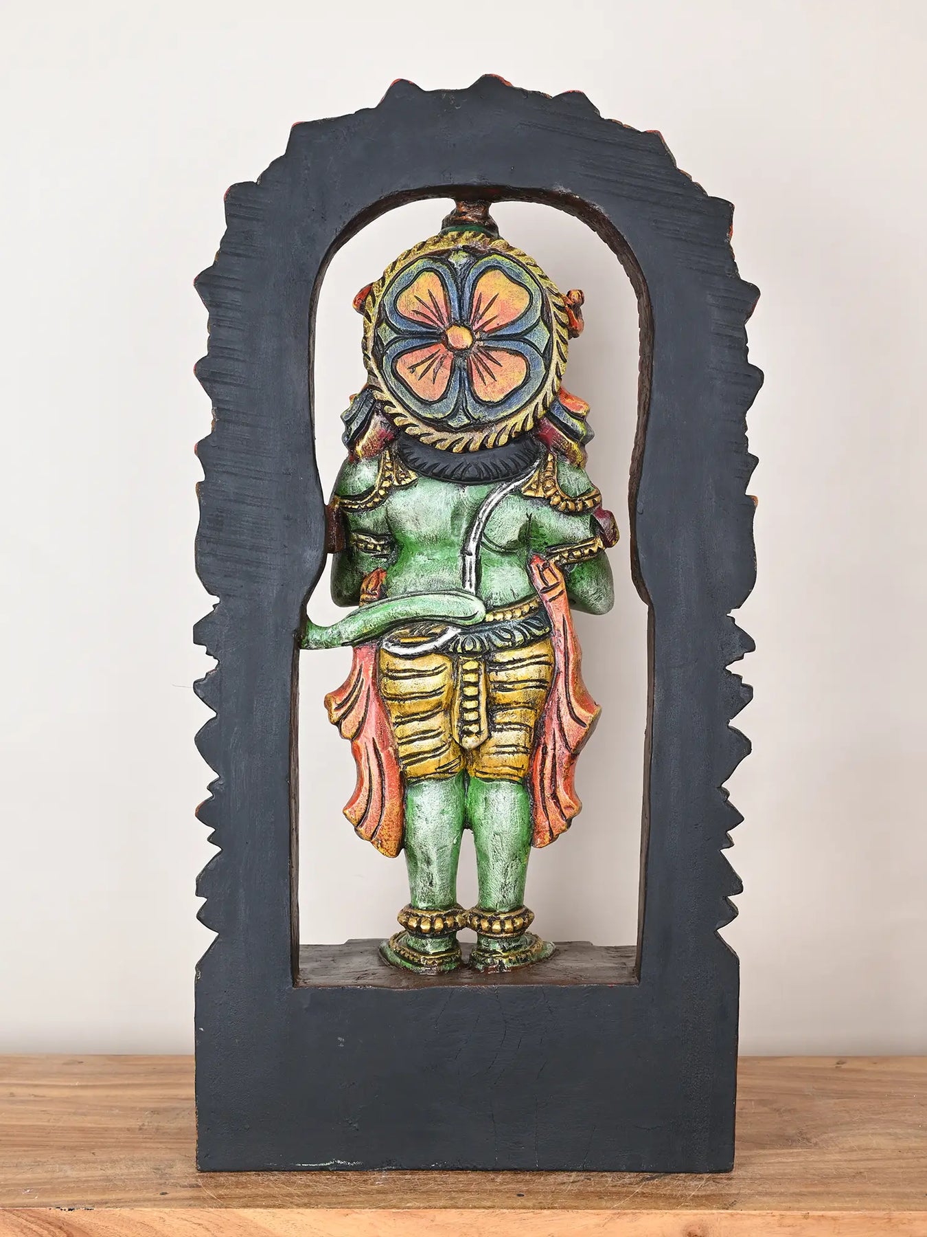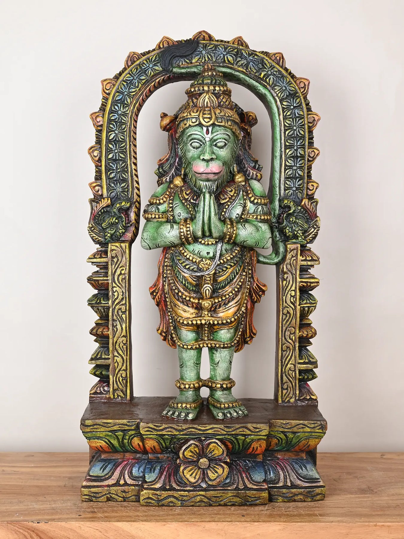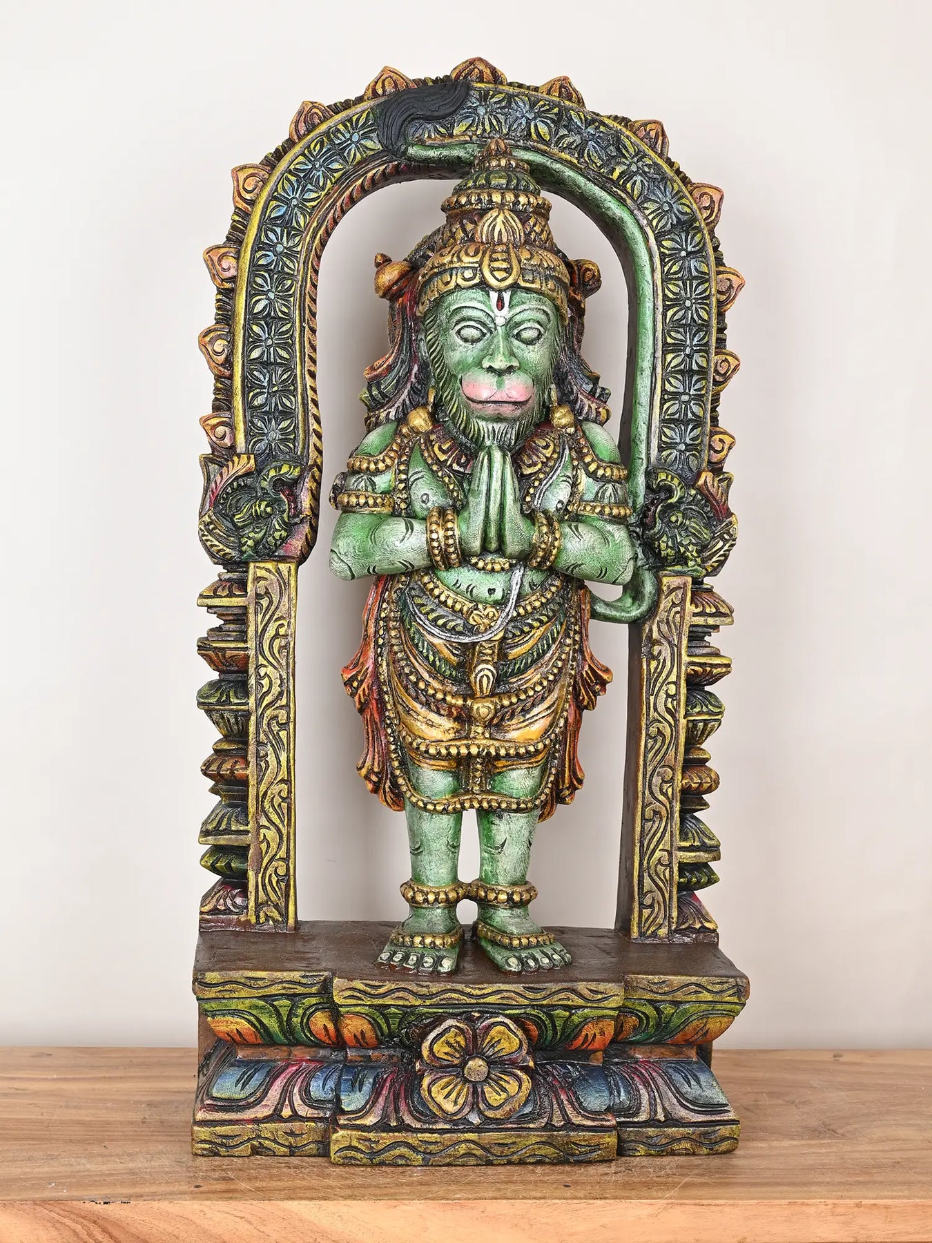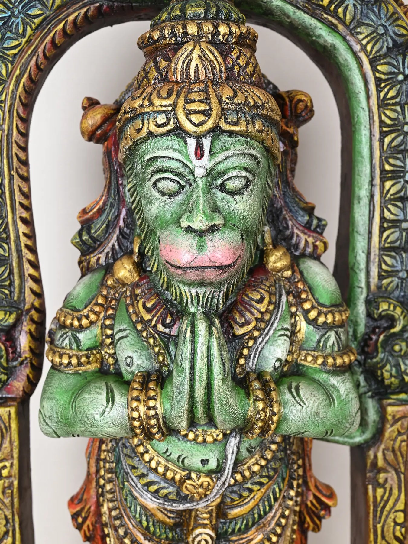 Hanuman wooden statue multicolored is depicted in a dynamic standing posture, represent strength, courage, and devotion. His hands are folded in Anjali Mudra, expressing humility and his eternal service to Lord Rama.