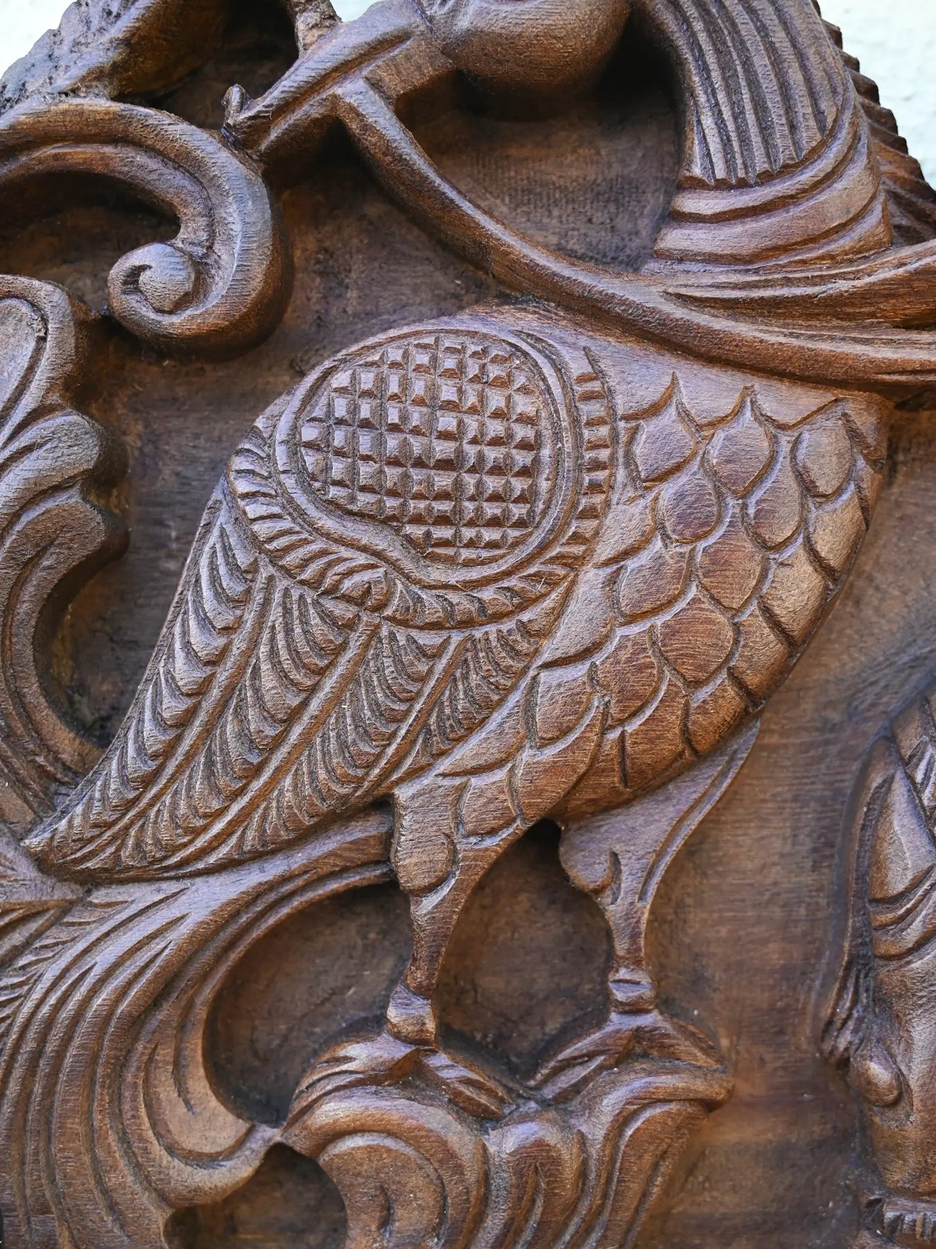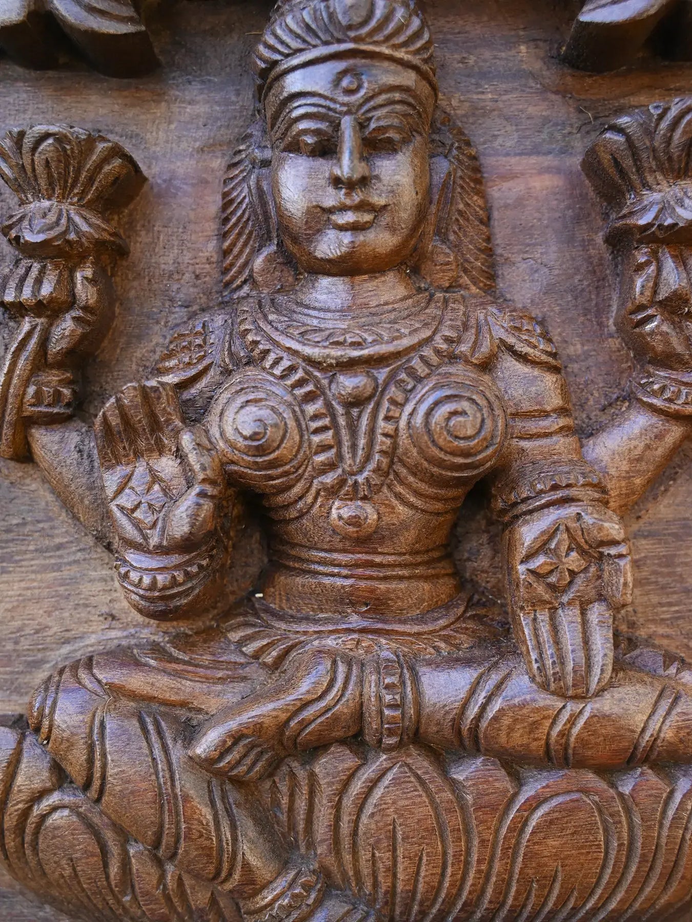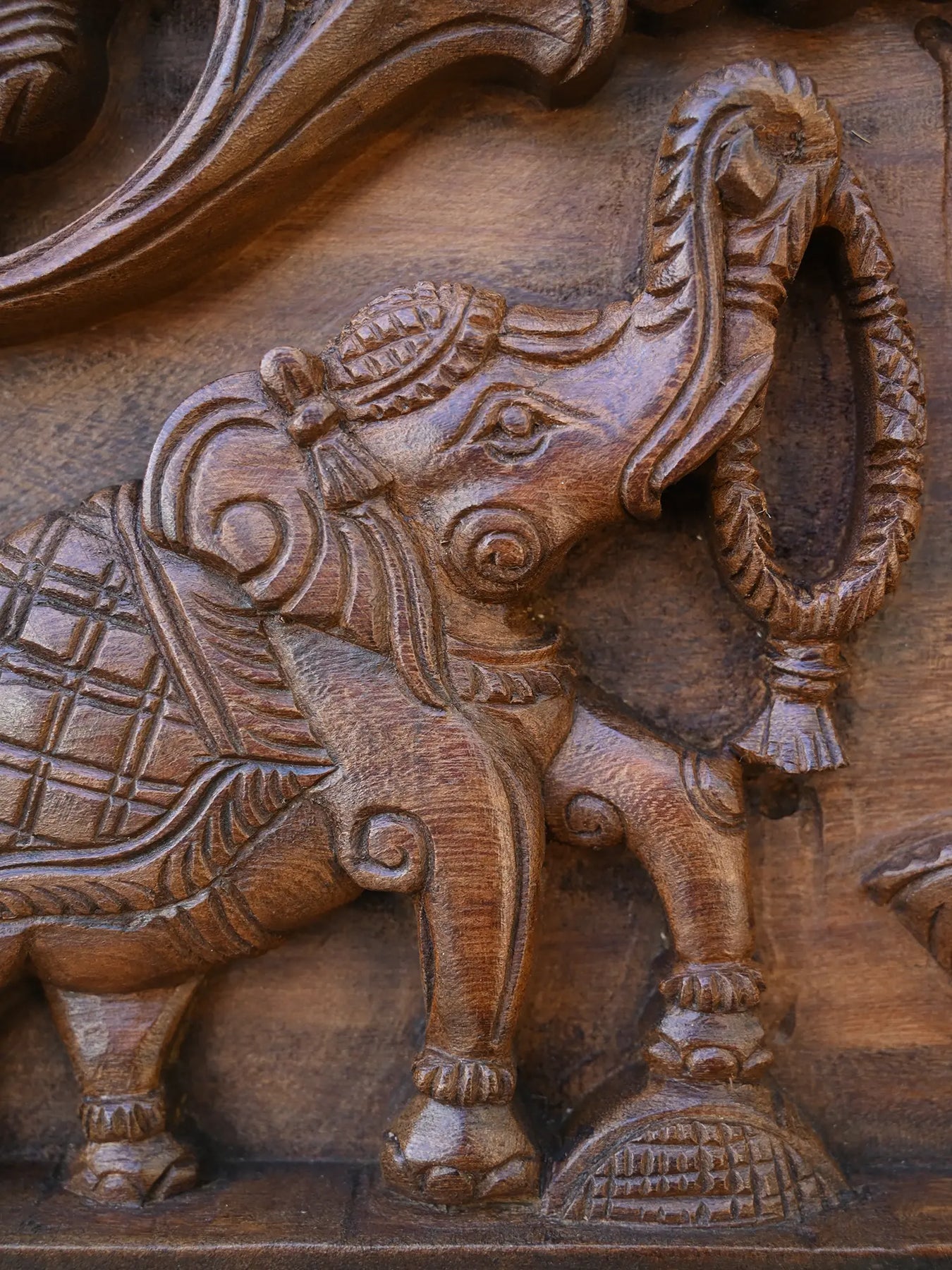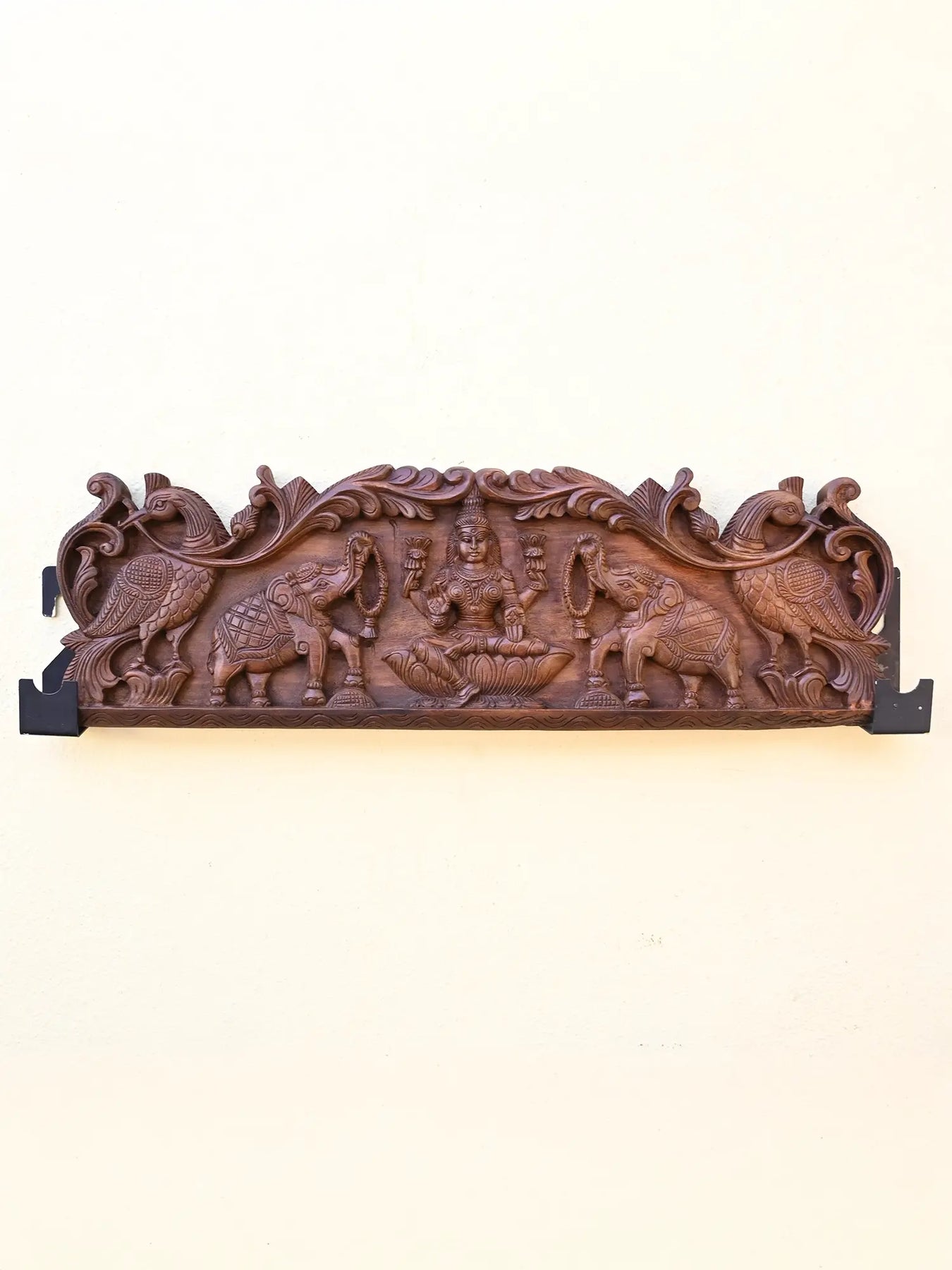 Gaja Lakshmi wooden wall panel depicts sitting on a lotus, surrounded by elephants and peacocks, represent wealth and knowledge.