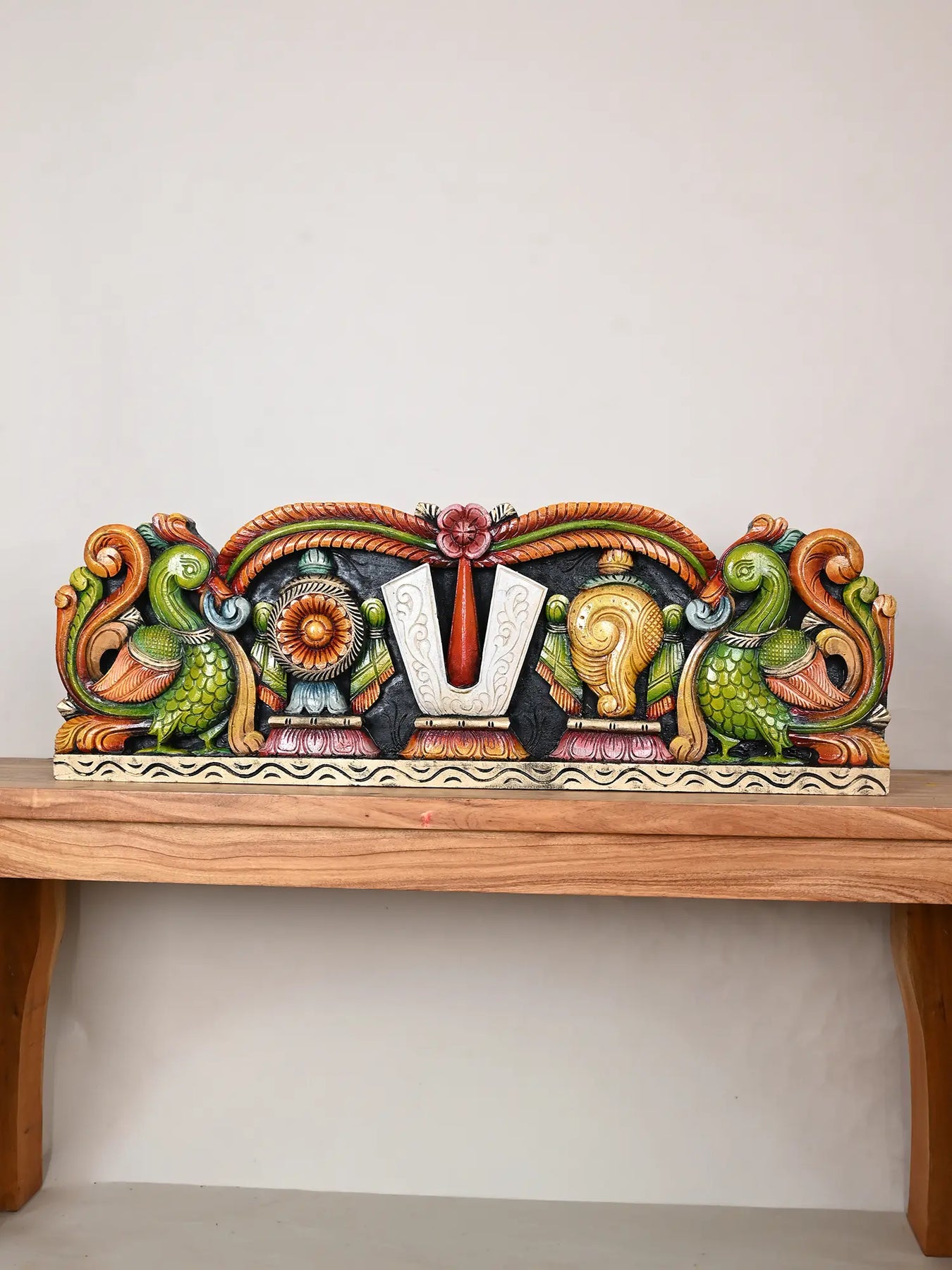 Wooden Sangu Chakra Namam panel displays the Thirunamam symbol of Lord Vishnu, flanked by the Shankha and Chakra. Colorful bird carvings add a vibrant touch to the traditional design.