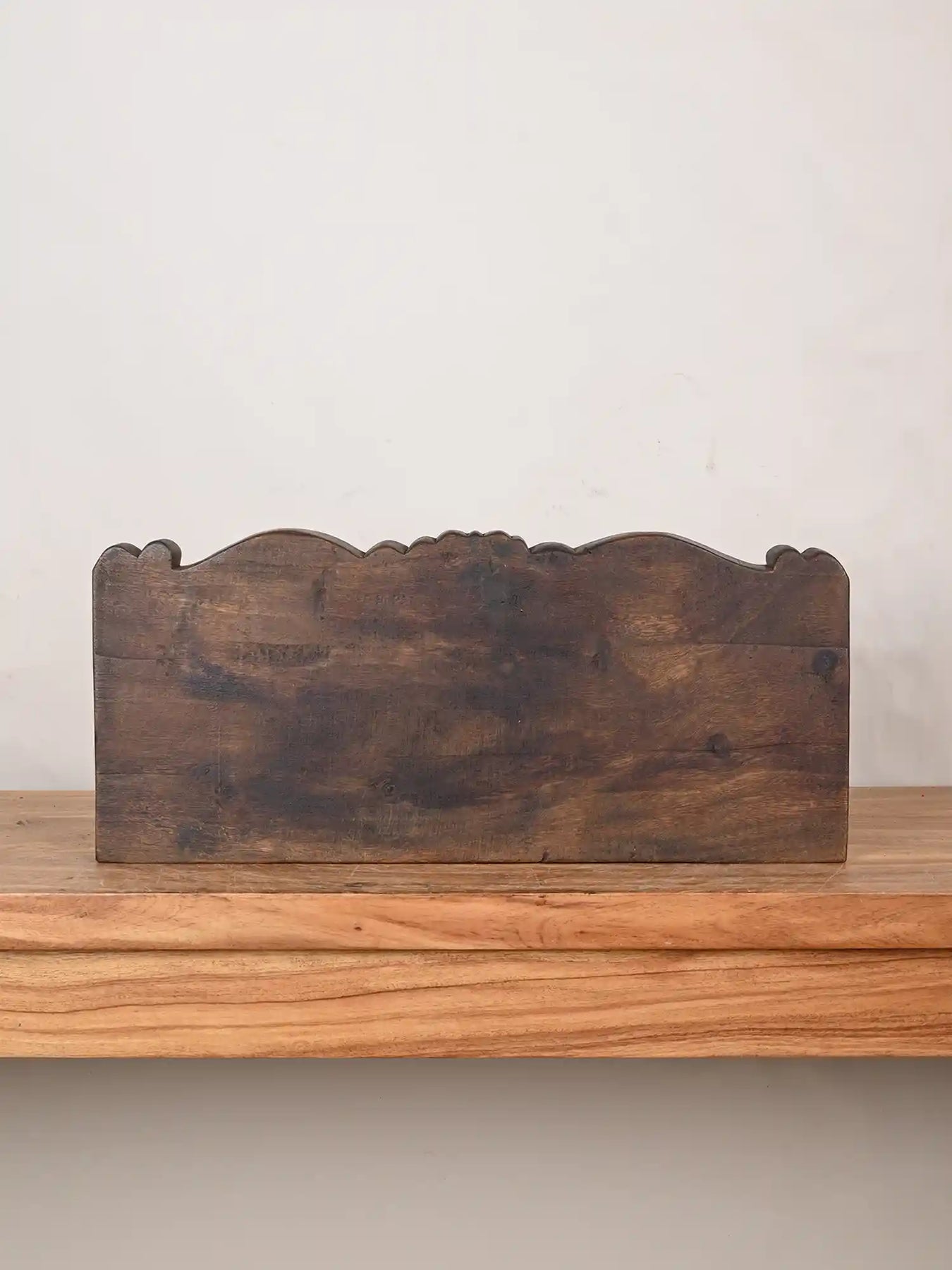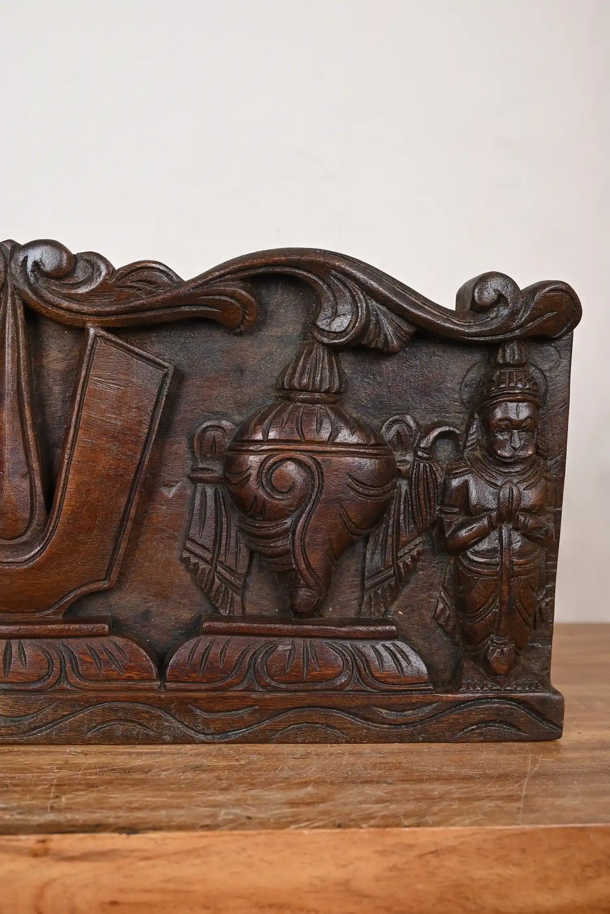 Wooden wall panel of Vishnu's symbol features, flanked by the Sudarshana Chakra and Panchajanya Shankha, and Garuda with Hanuman. Ideal for decorating homes, temples, or meditation areas.