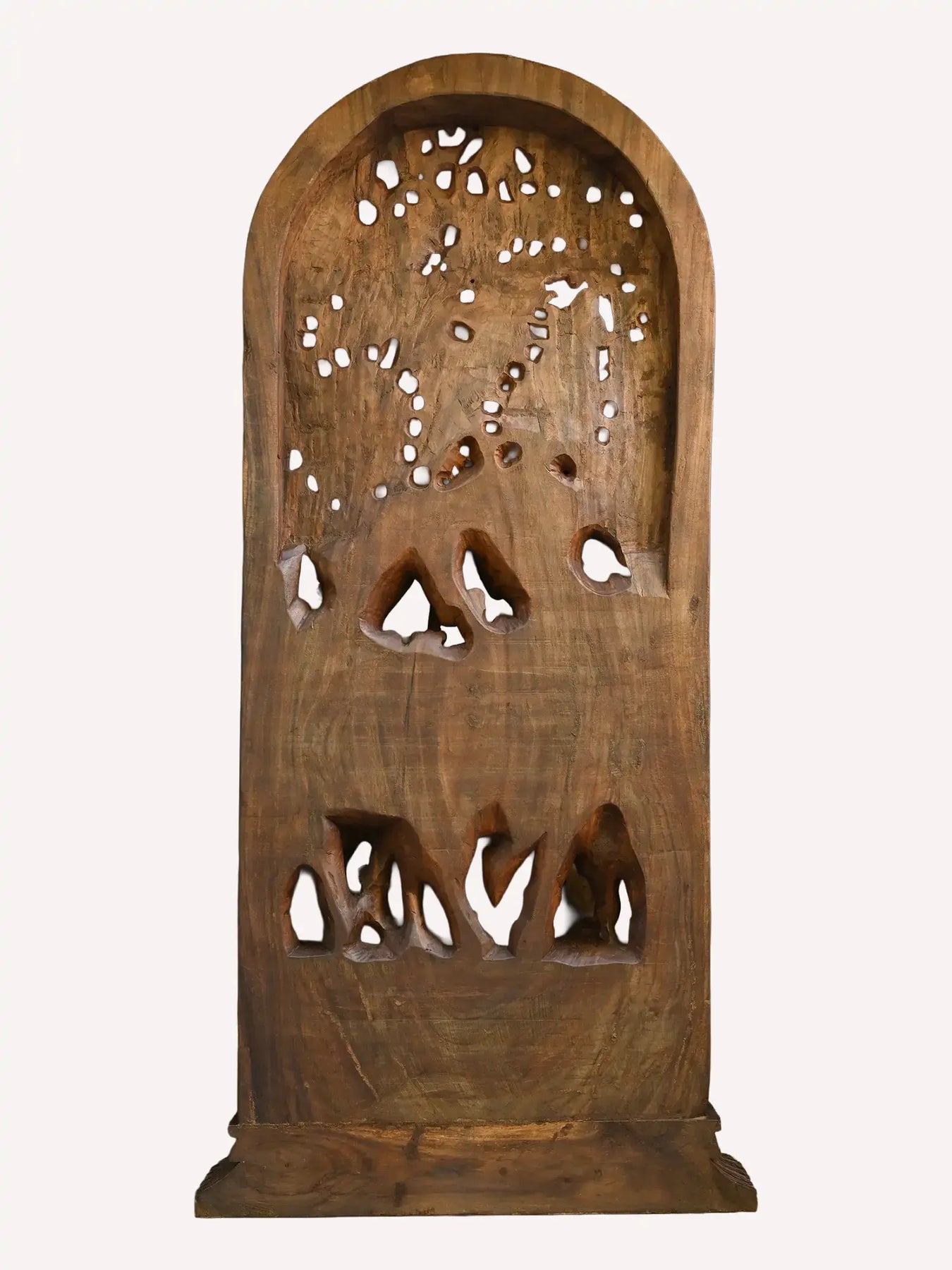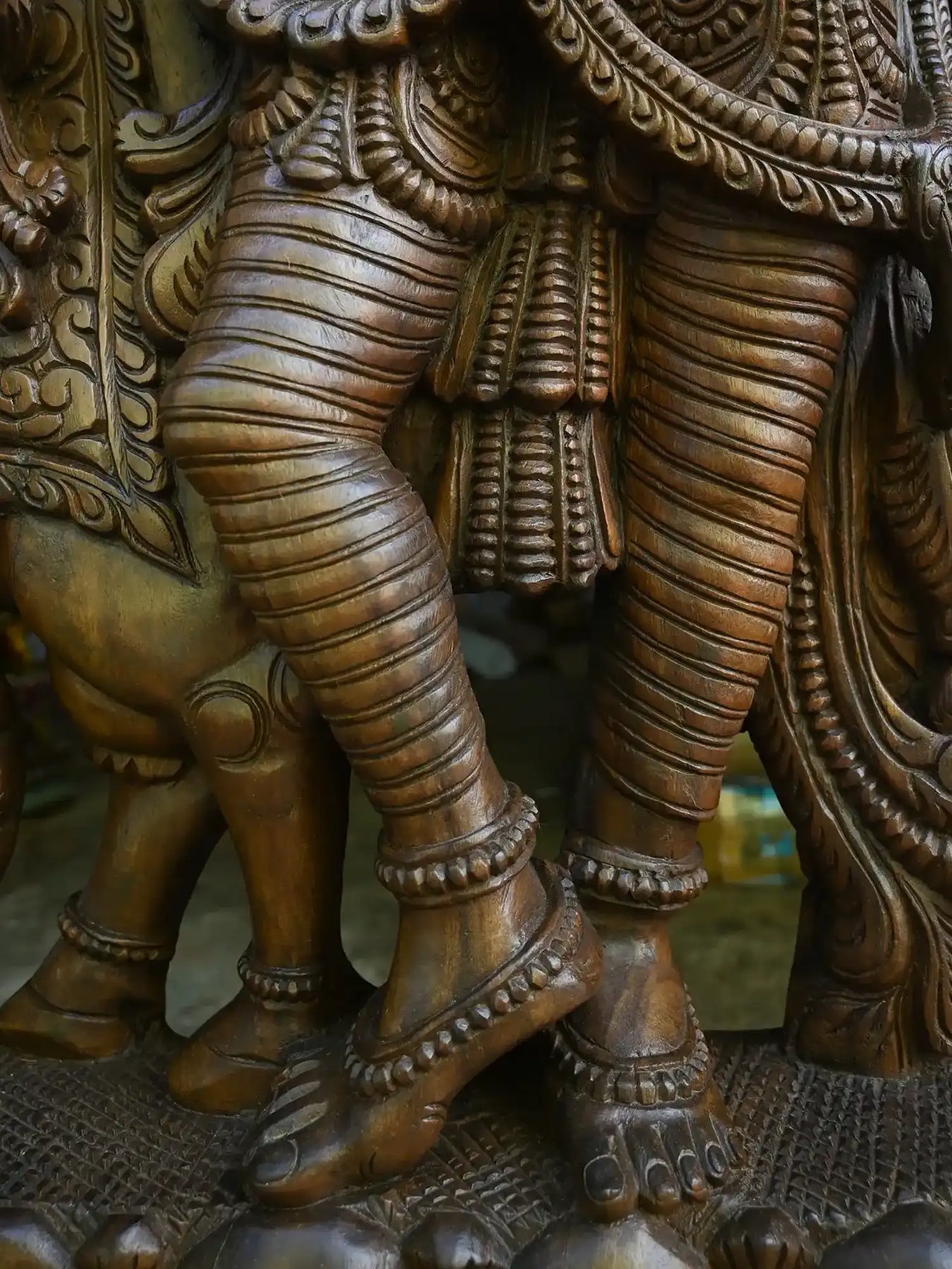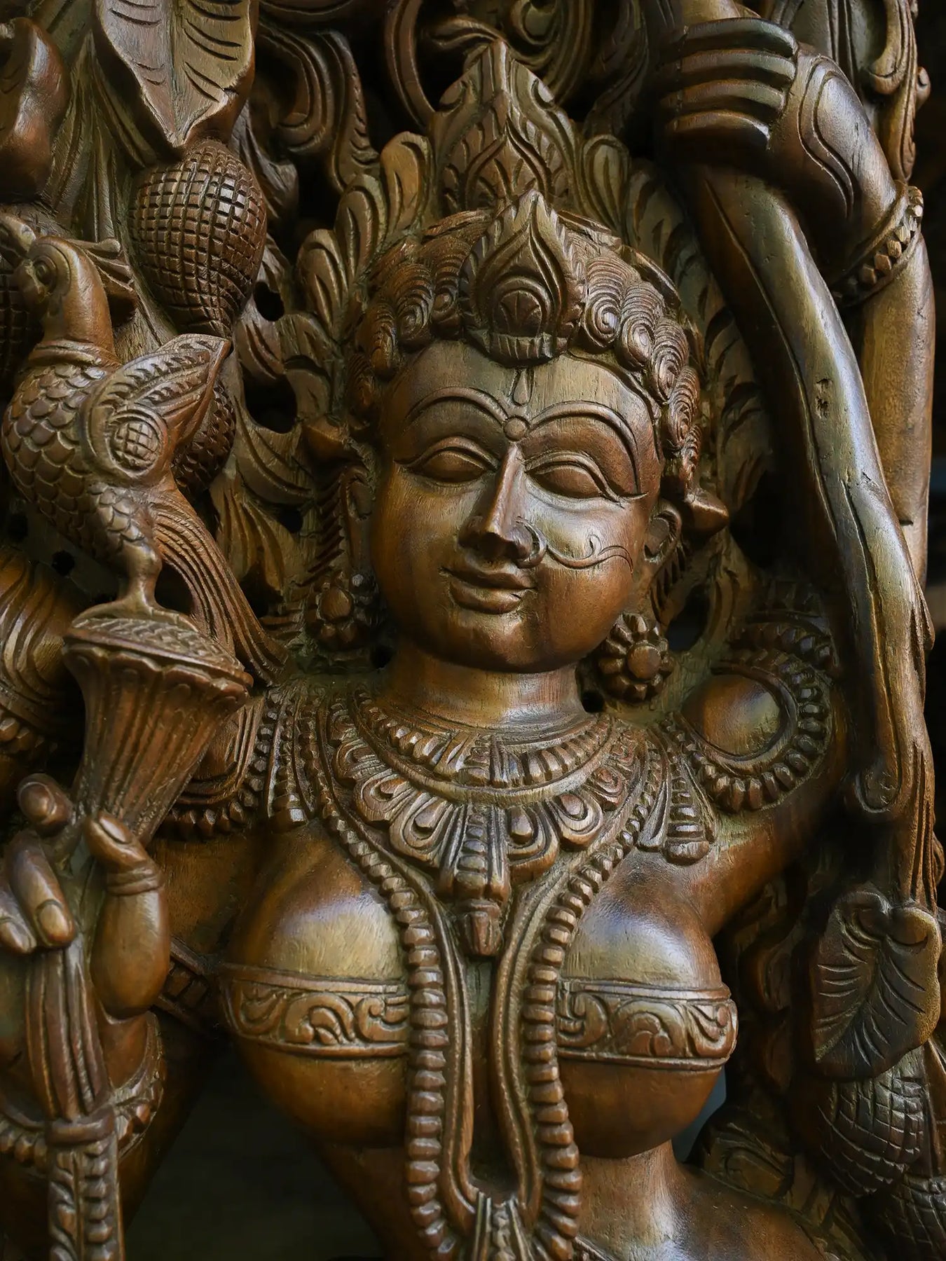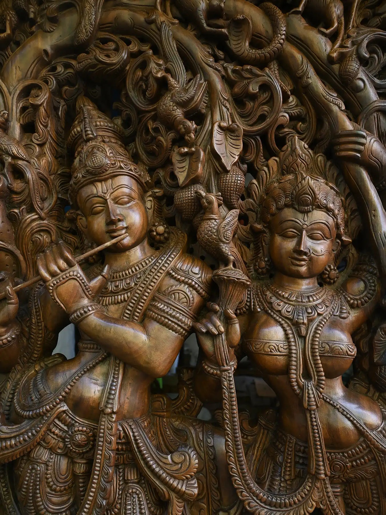 Wooden jaliwork Lord Krishna and Radha stand together gracefully. Krishna plays his flute while Radha looks at him with love and devotion. A cow stands below Krishna. The sculpture symbolizes eternal love, devotion, and harmony.