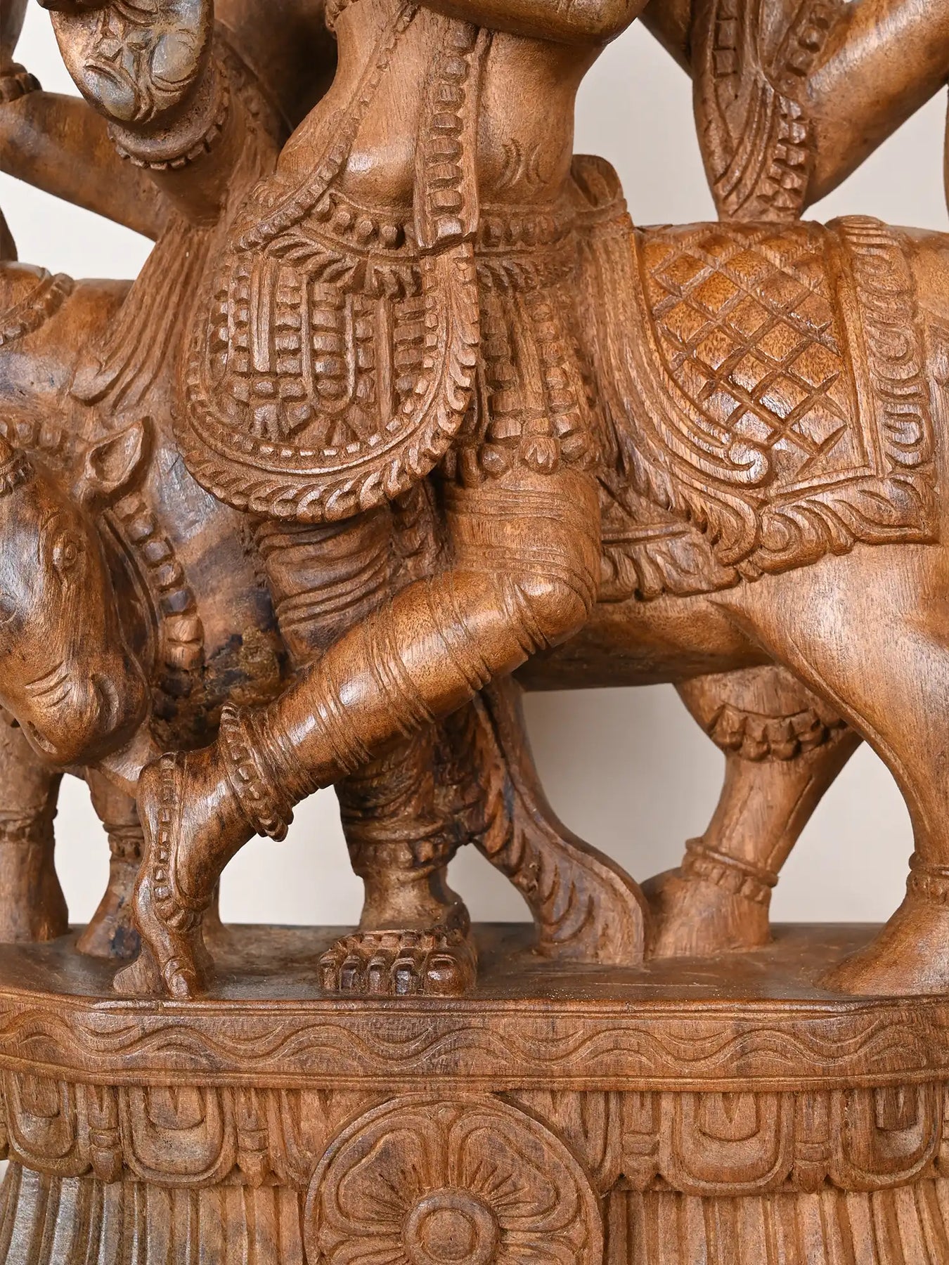 Wooden Lord Gopala Krishna statue, is depicted gracefully playing his flute while standing atop a sacred cow. This intricately carved piece reflects the traditional South Indian temple style, making it an elegant decorative sculpture for spiritual or home spaces.