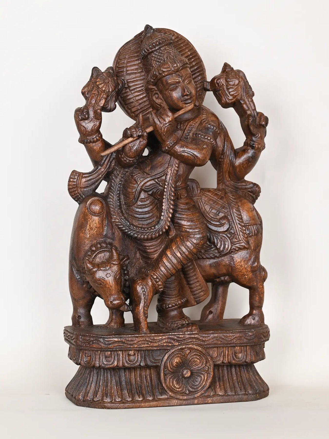 Wooden Lord Krishna idol is portrayed standing with grace, playing the flute next to a cow, representing his sacred relationship with nature and all living beings. His elegant stance, with one leg crossed over the other, captures his tranquil and playful essence.