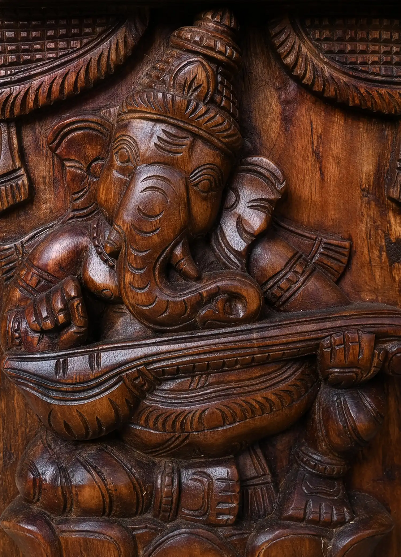 Traditional Indian Musical Ganesha Wooden handCarved vertical Panel 36"