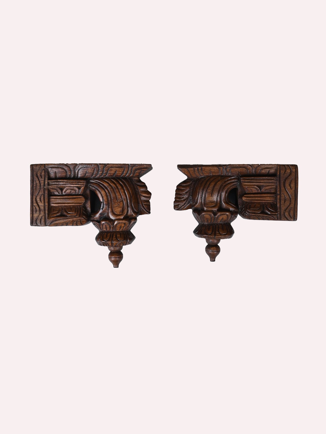 Bodhil Wooden wall brackets are crafted in a traditional south Chettinad-style design. Made from the wood of vaagai with an antique finish, they feature detailed work and temple-inspired shapes. Ideal for enhancing entryways, pooja rooms, or for use as unique shelf supports.