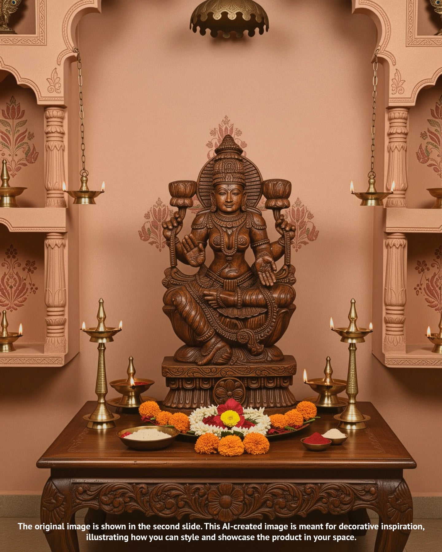 Large Four-Armed Devi Lakshmi Seated on Lotus Pedestal. Two hands are holding flowers, and two hands are Abhaya and Varada Mudra. Goddess Lakshmi Devi is finished with natural woodwork.
