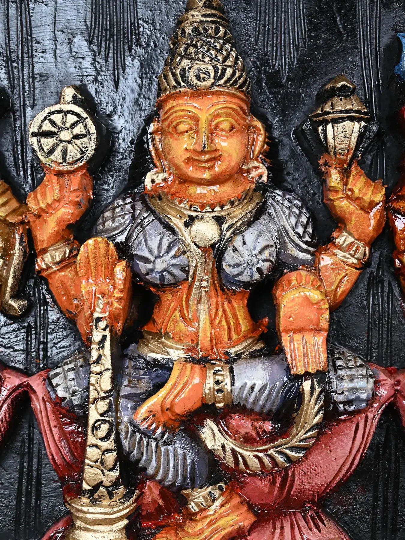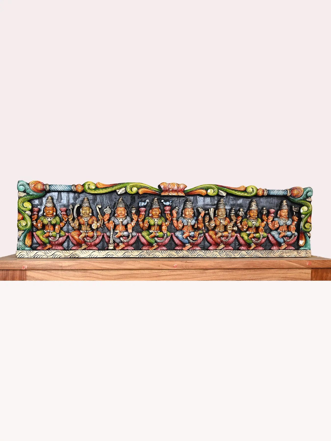 Wooden Ashtalakshmi wall panel depicts, the eight forms of Goddess Lakshmi. Made from a single piece of wood, it is painted in vibrant colors and serves as a decorative wall hanging, representing blessings of wealth, health, and success.