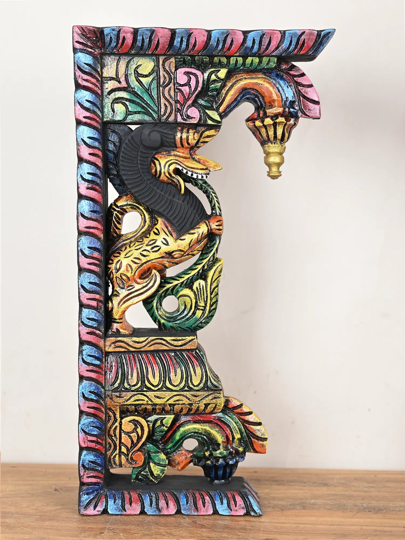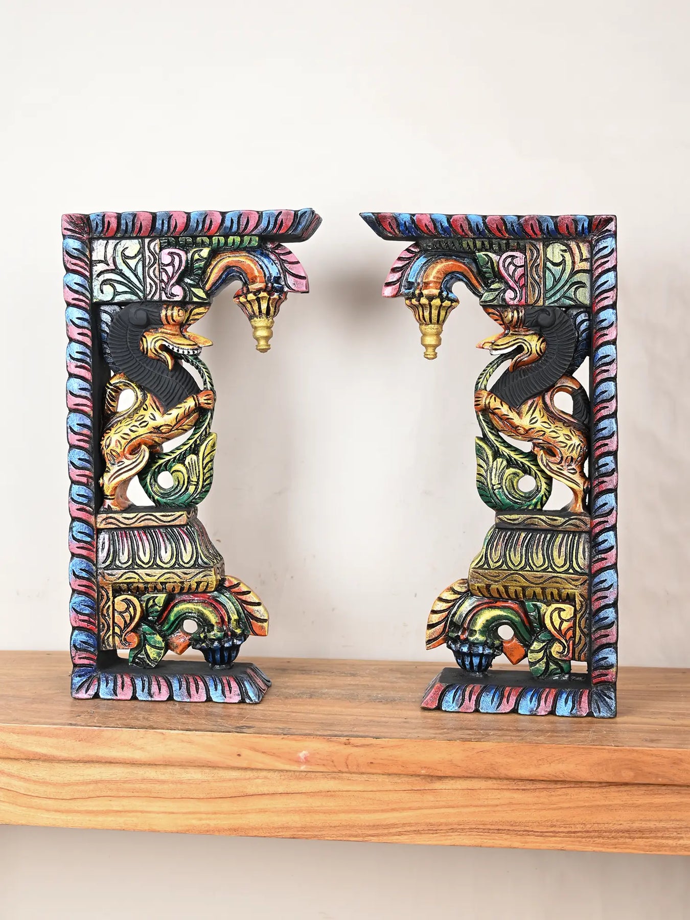 Wooden pair of Yali brackets features a rider on horseback positioned above the mythical Yali creature, they bring an elegant and distinctive decorative charm to doorways or walls.