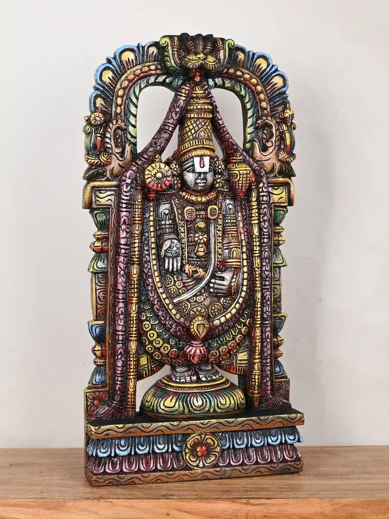 Wooden statue of Lord Venkateswara, also known as Tirupati Balaji, who is considered an incarnation of Lord Vishnu, standing in his sacred form from the Tirumala temple.  In his upper hands, he holds a discus (Chakra), a symbol of power, and a conch shell (Shankha)