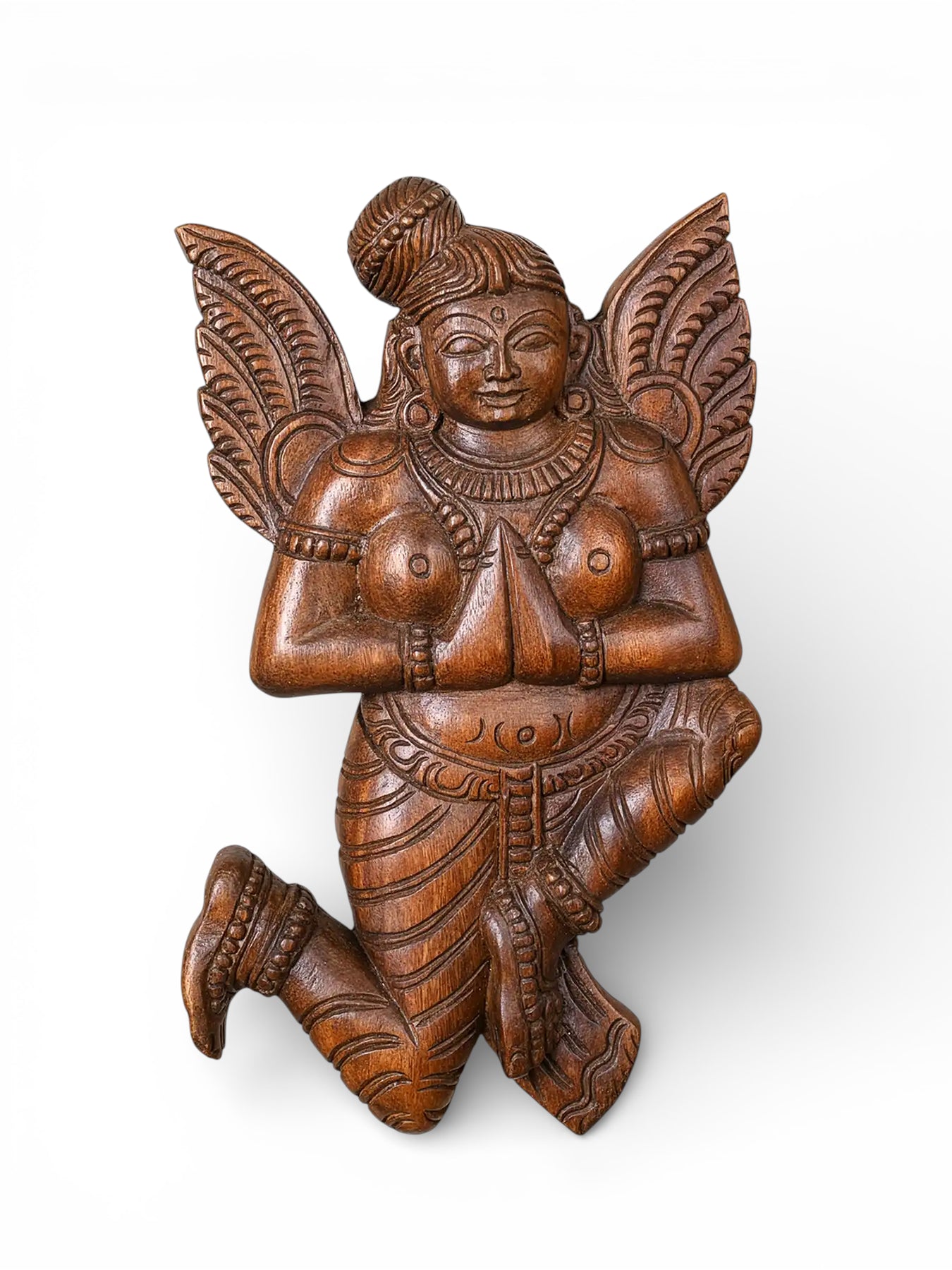 Gandharvas are celestial musicians from Hindu mythology, revered for their divine artistry and enchanting presence. This exquisite wooden carving captures the grace and elegance of these legendary beings, showcasing intricate craftsmanship and attention to detail. Each piece reflects the masterful skill of traditional wood carving, making it a meaningful addition to your home or sacred altar.