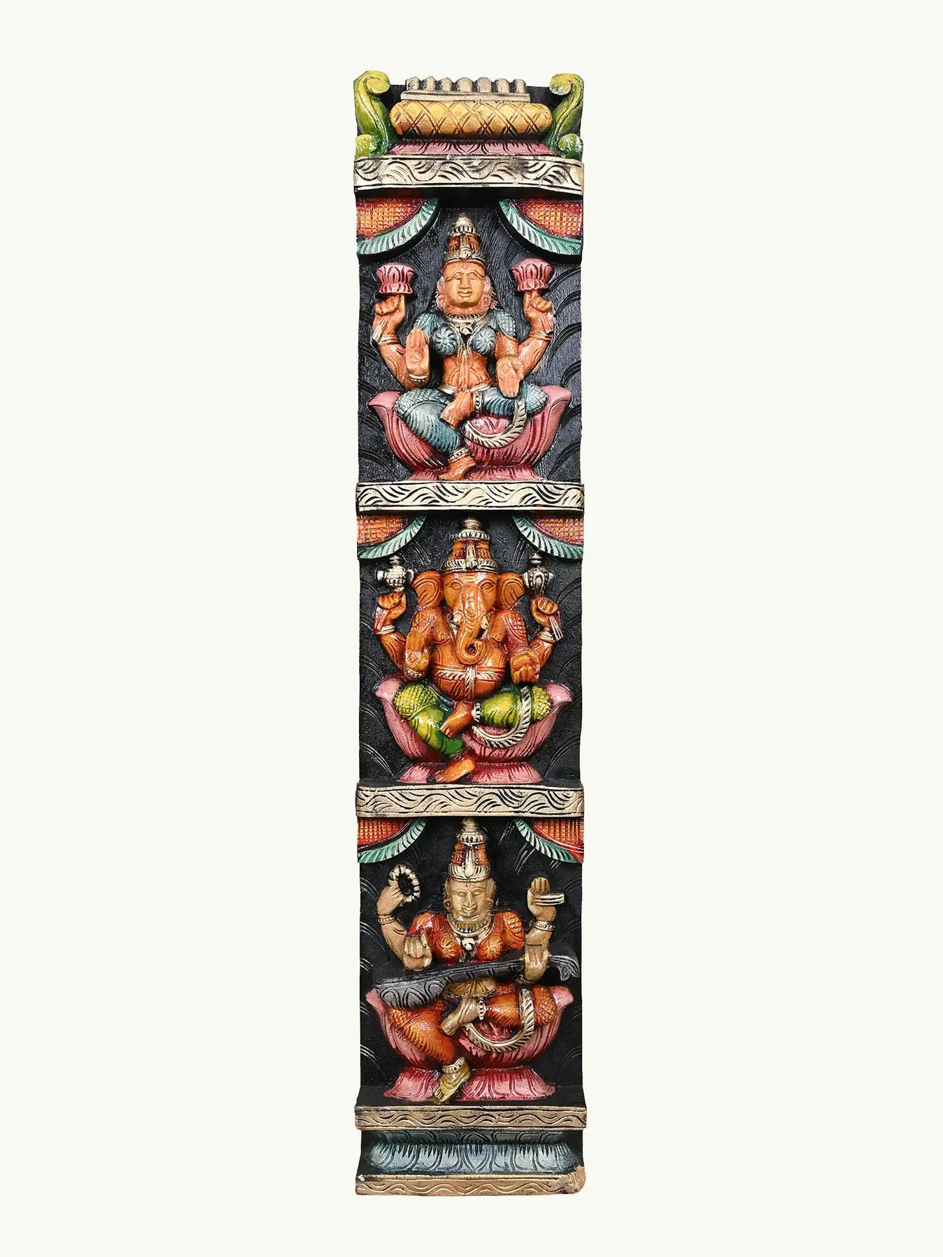 36" Wooden Lakshmi, Ganesh With Saraswathi Panel shows hand-painted and three deity sits on a lotus flower, representing wisdom, prosperity, and knowledge.