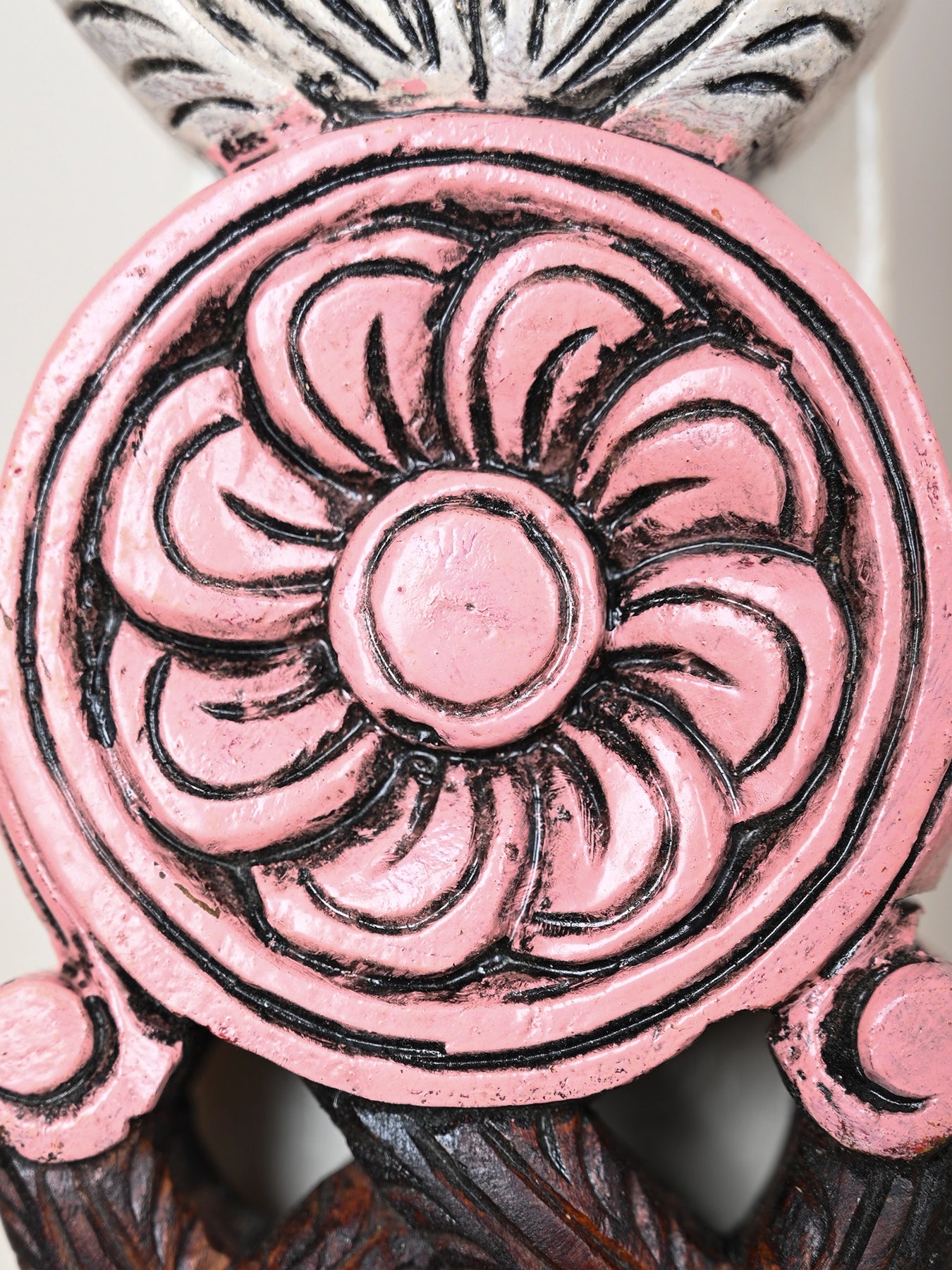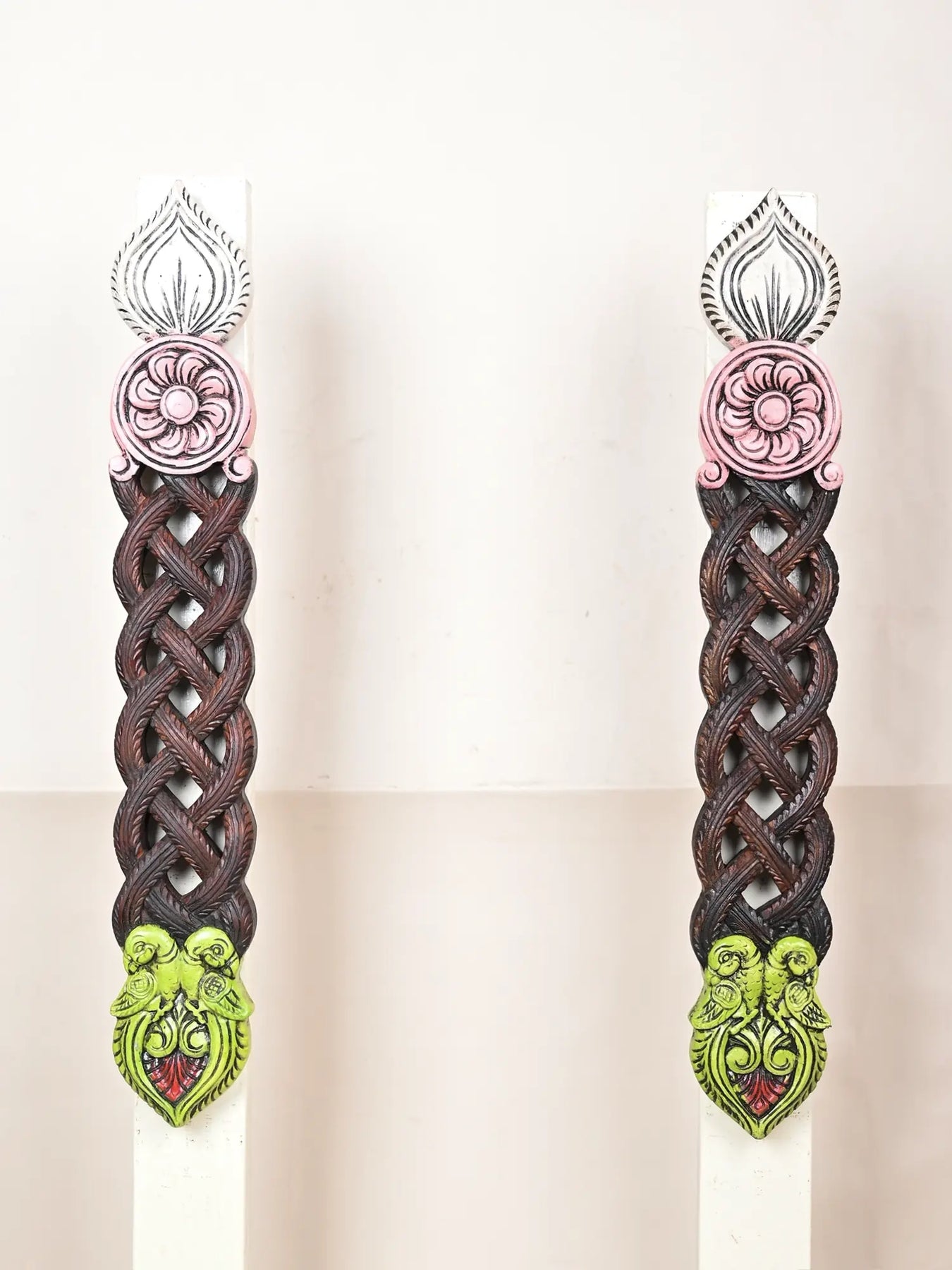 Bharma teak wood paired artwork wall mount features a braided vine design with a lotus bud and floral medallion in soft pink and white tones, representing purity. The bottom part displays two finely carved parrots facing each other.