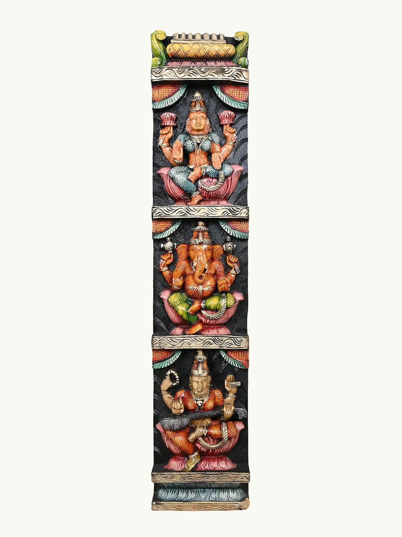 Wooden Lakshmi, Ganesh, and Saraswathi Panel features hand-painted detailing, depicting the three deities seated on lotus representing wisdom of knowledge