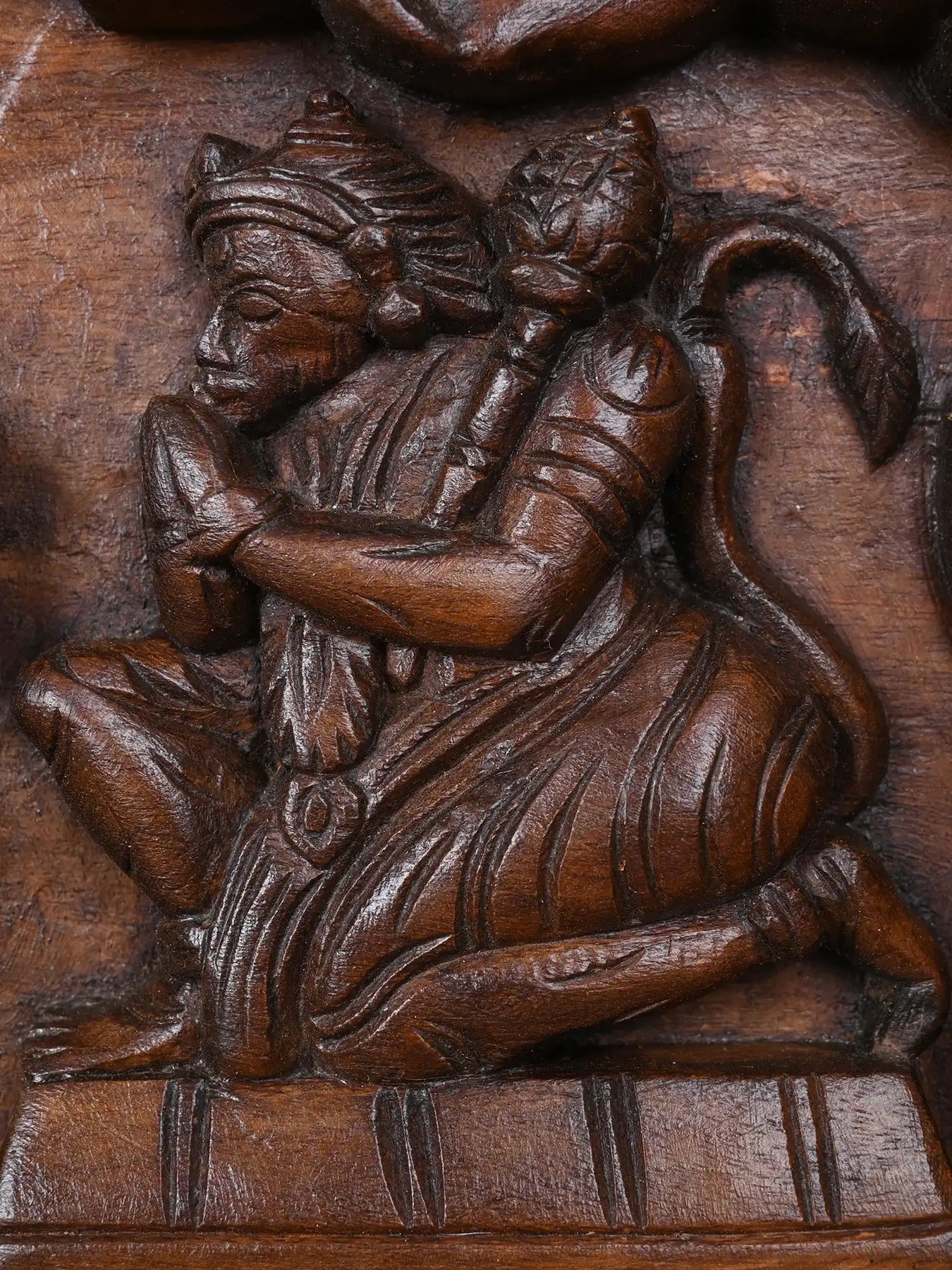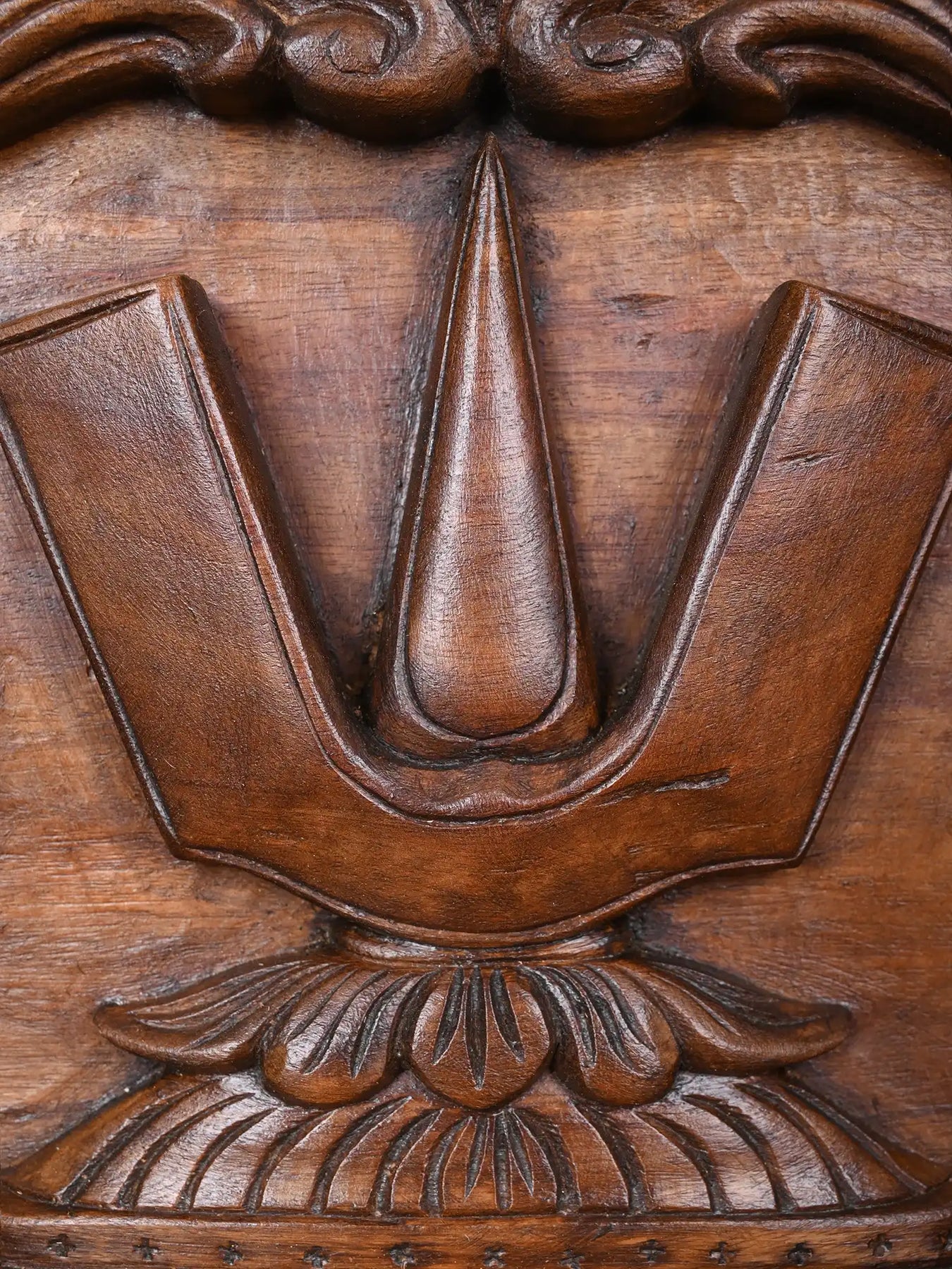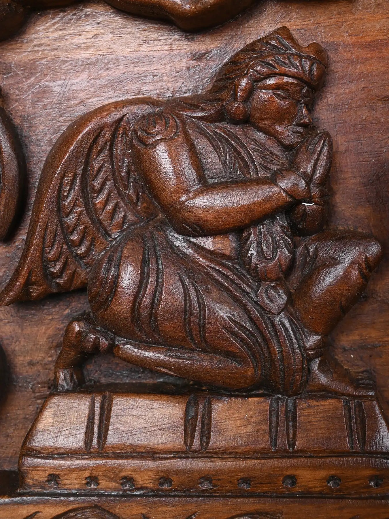 Wooden Lord Vishnu’s symbols on the right side, you can see the Sudarshana Chakra with Garuda, on the left side, the Panchajanya Shankha, Hanuman, beautifully carved scrollwork and floral patterns, enhancing the aesthetic richness of the panel.