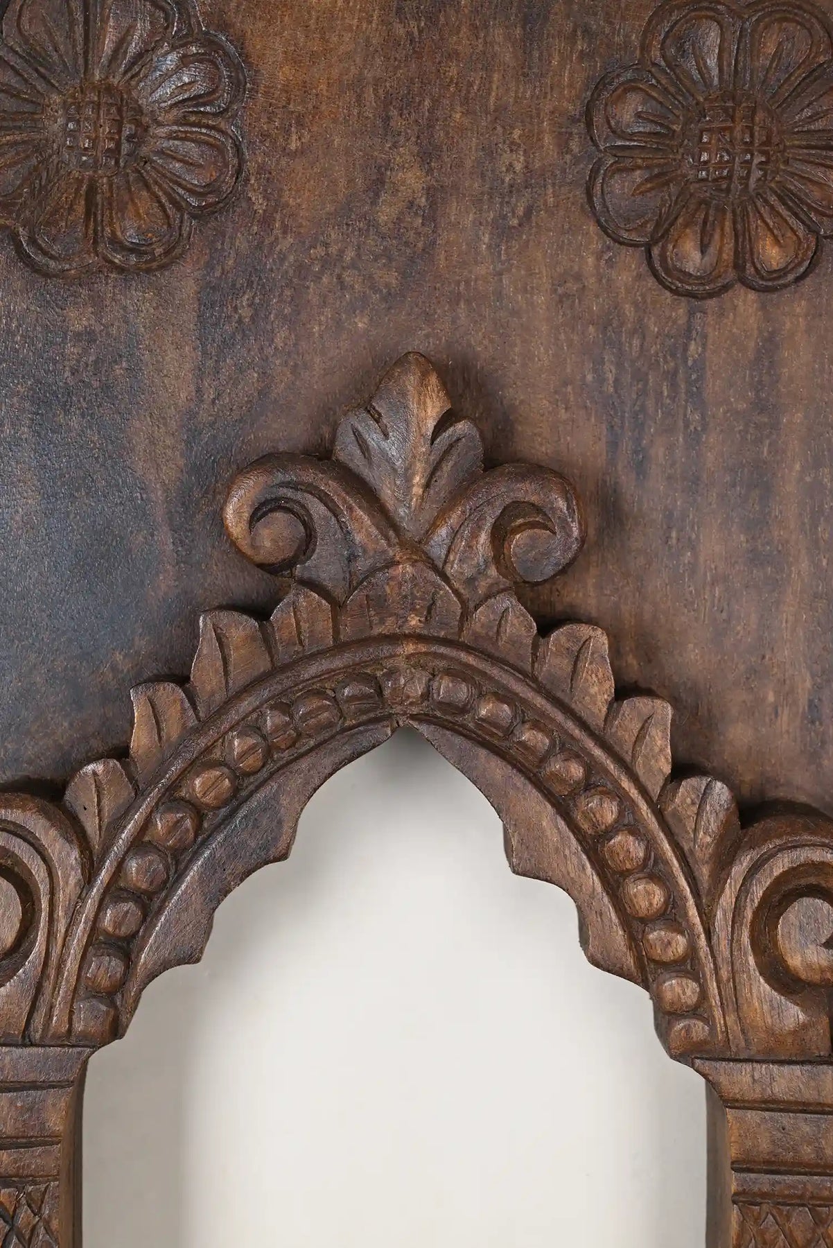Wooden mirror frame features a traditional temple-style arch, floral motifs, and ancient lattice detailing. Its rich finish and intricate carvings add a vintage charm, making it a perfect decorative highlight for any wall or interior space.