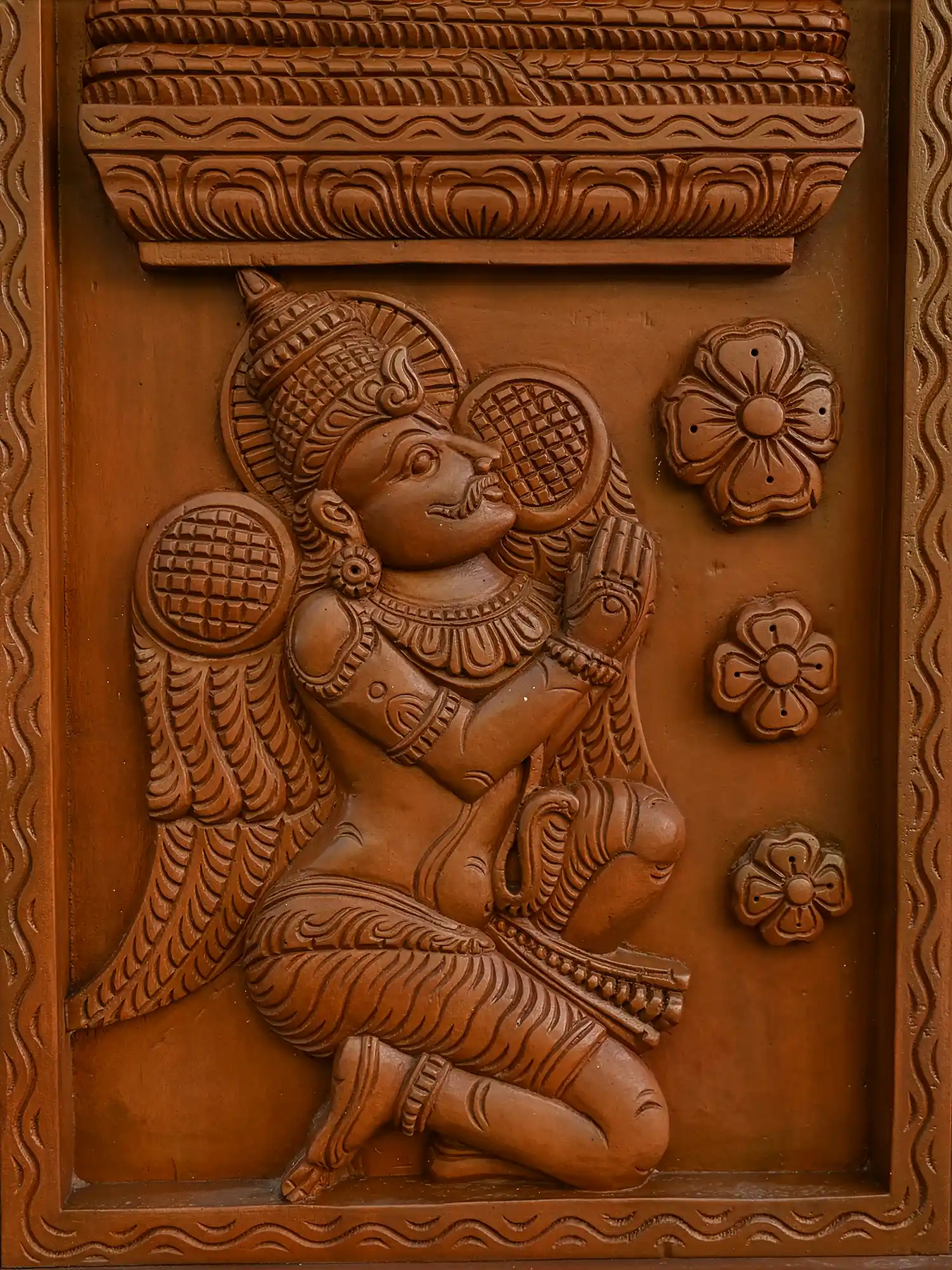 Wooden pooja mandapam featuring intricate geometric and floral designs, crowned with five kalash finials. The panels depict Lord Vishnu, Garuda, Goddess Lakshmi, and Hanuman in traditional iconographic style.