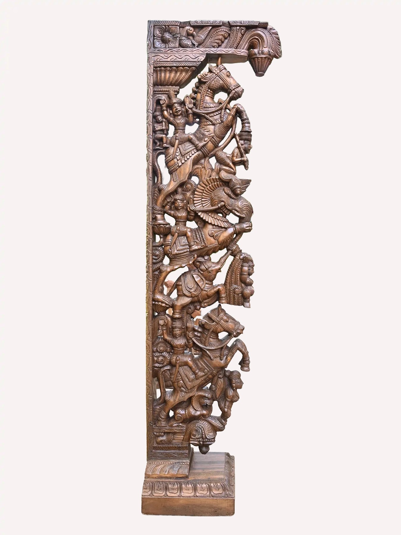 Pair of wooden horse & Yali warrior door brackets features detailed carvings of warriors, celestial beings, elephants, and yalis. The tall and elegant design makes them perfect for temple entrances, pooja rooms, or traditional homes, adding a grand and majestic look to the doorway.
