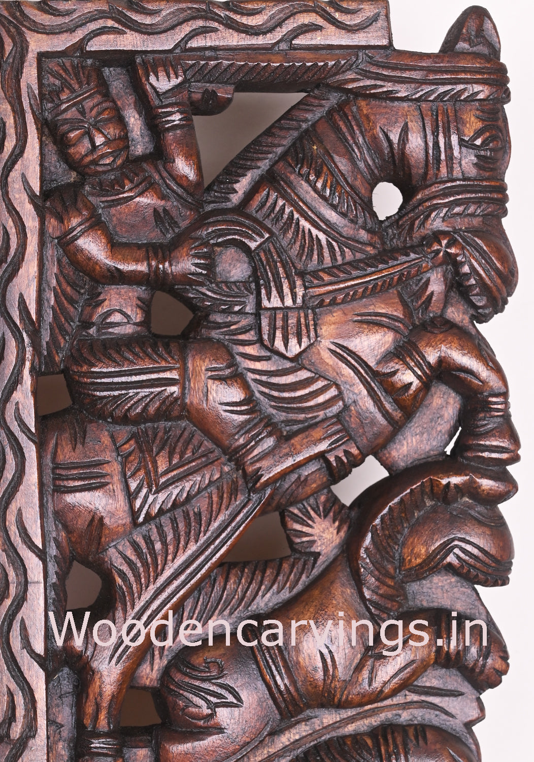 Horse Upraised Both of them legs,This type of wall Brackets Good For Home Vastu,some peoples believe it gives carrier level changes and increments.wax brown Finishing.its Ready For Your Beautiful Home,office or Pooja room Entrances.Light Weight Product,Hooks Fixed,Easily we are Handled.Made by Selective best quality long lasting country wood vaagai.